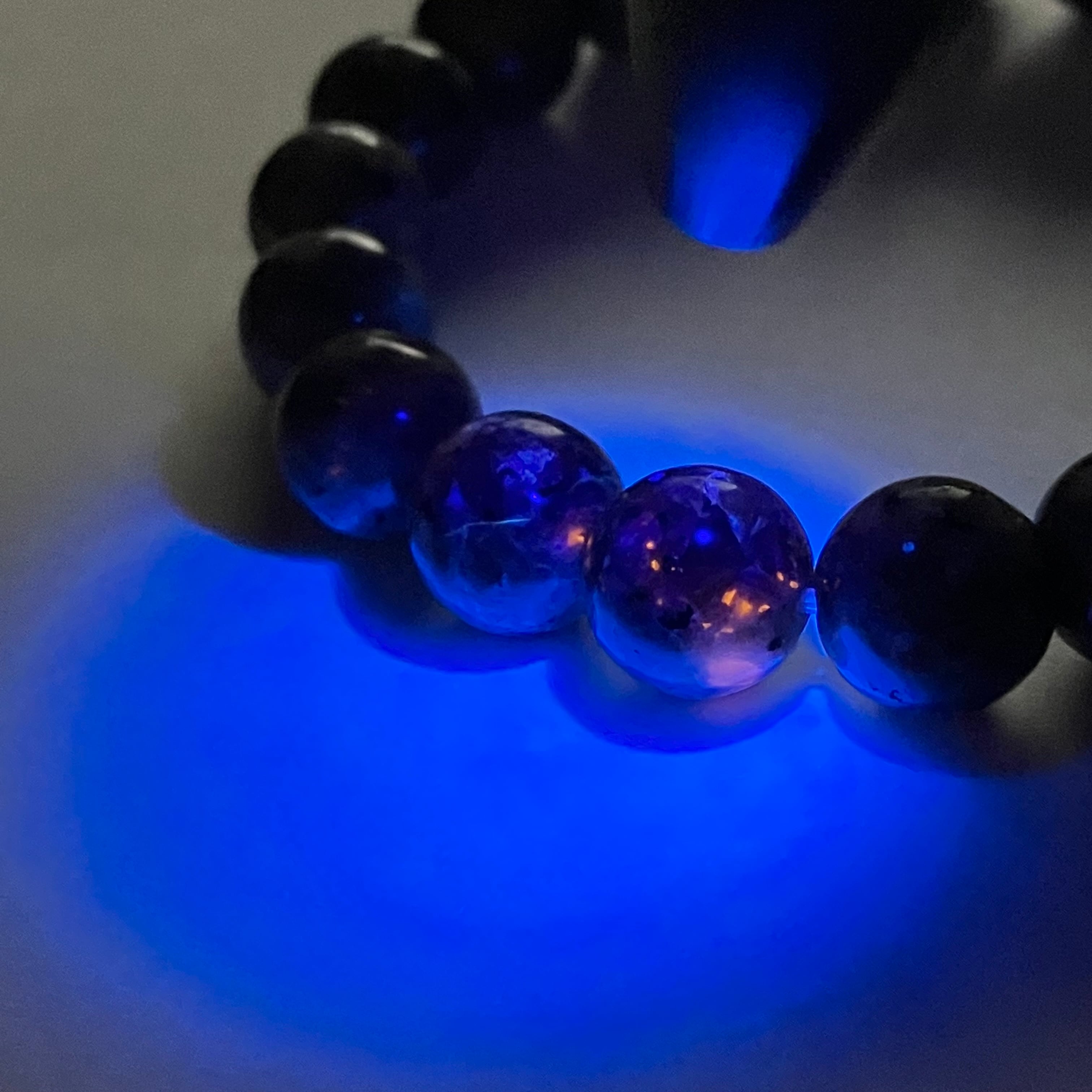 UVライトの照射によって蛍光ソーダライトを含む箇所が蛍光し、輝く鉱物「ユーパーライト」が入荷しました。