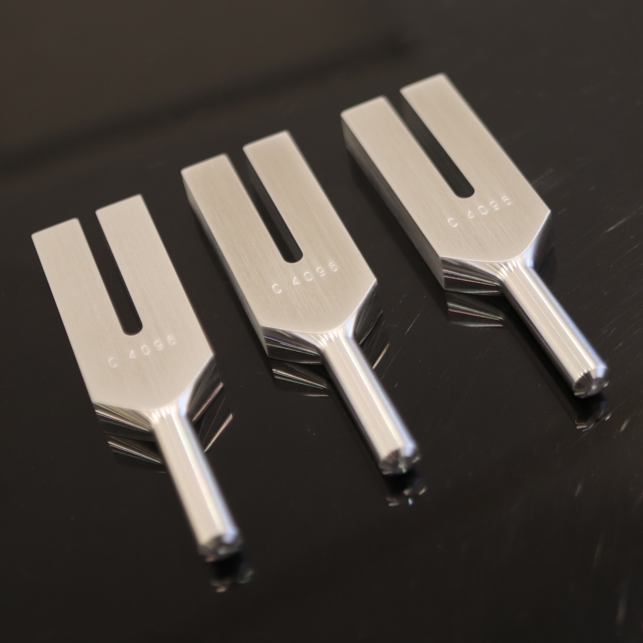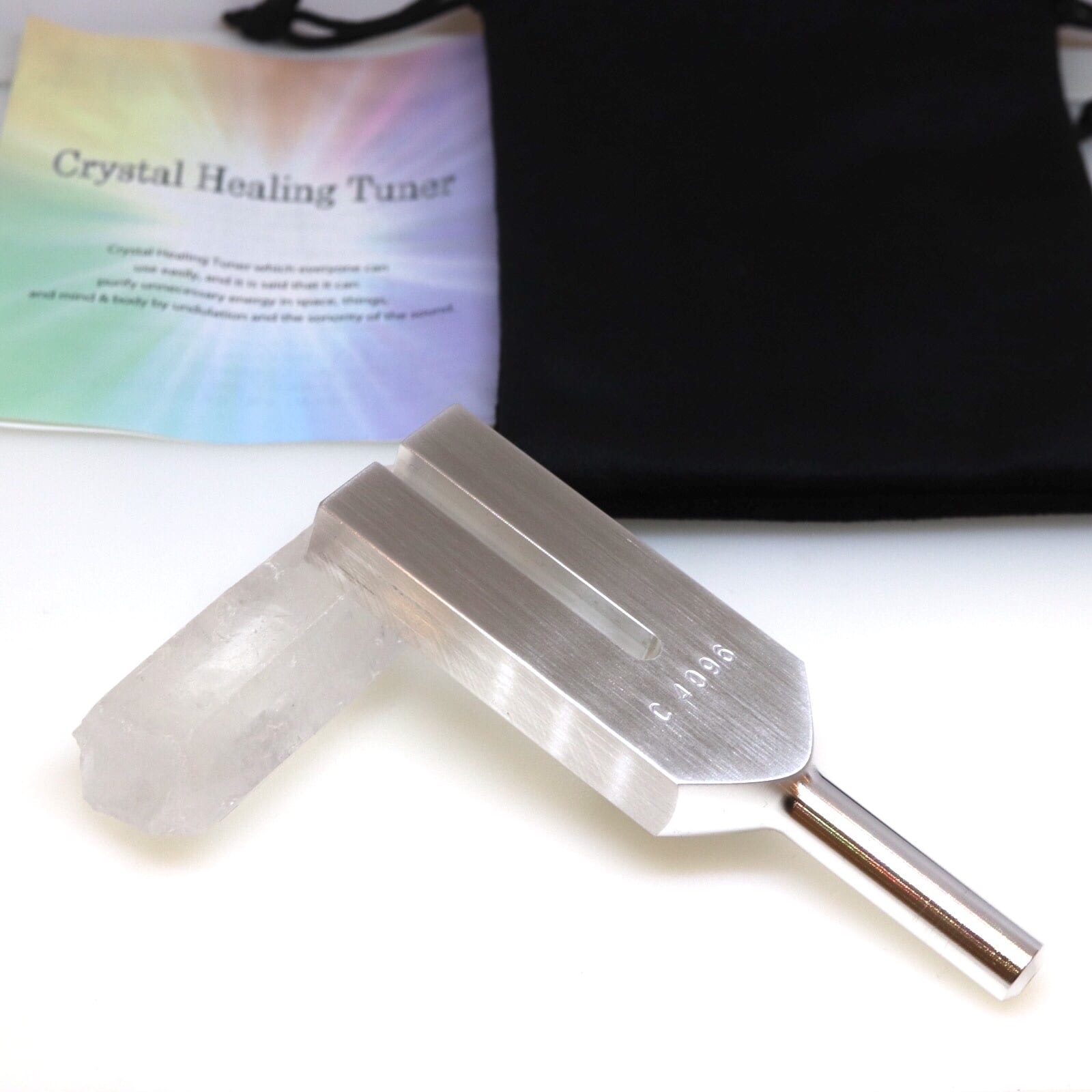チューナーを手に持ち、金属の先の部分で水晶をコンッと叩くと「キーーーーン」という心地よい高音がなります。