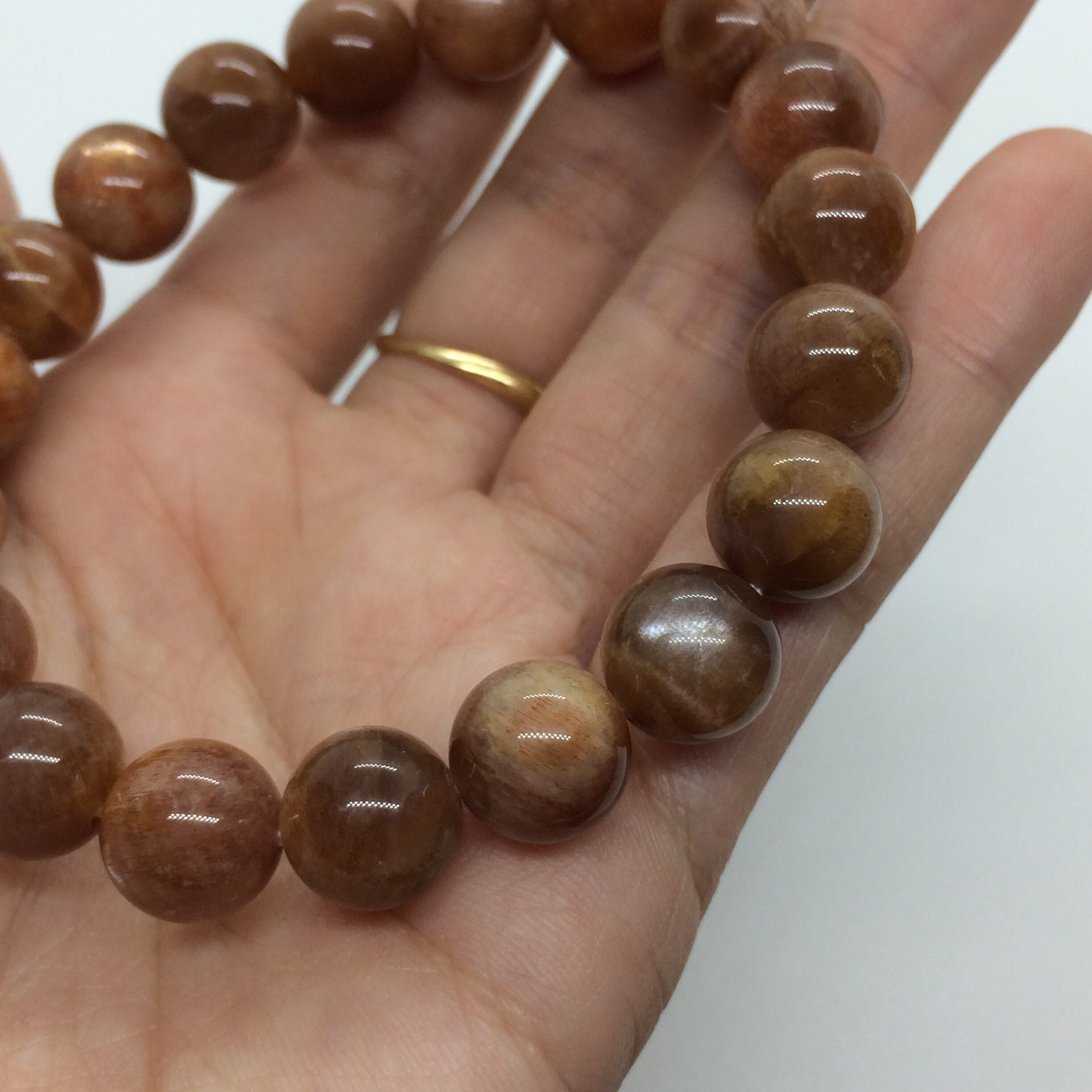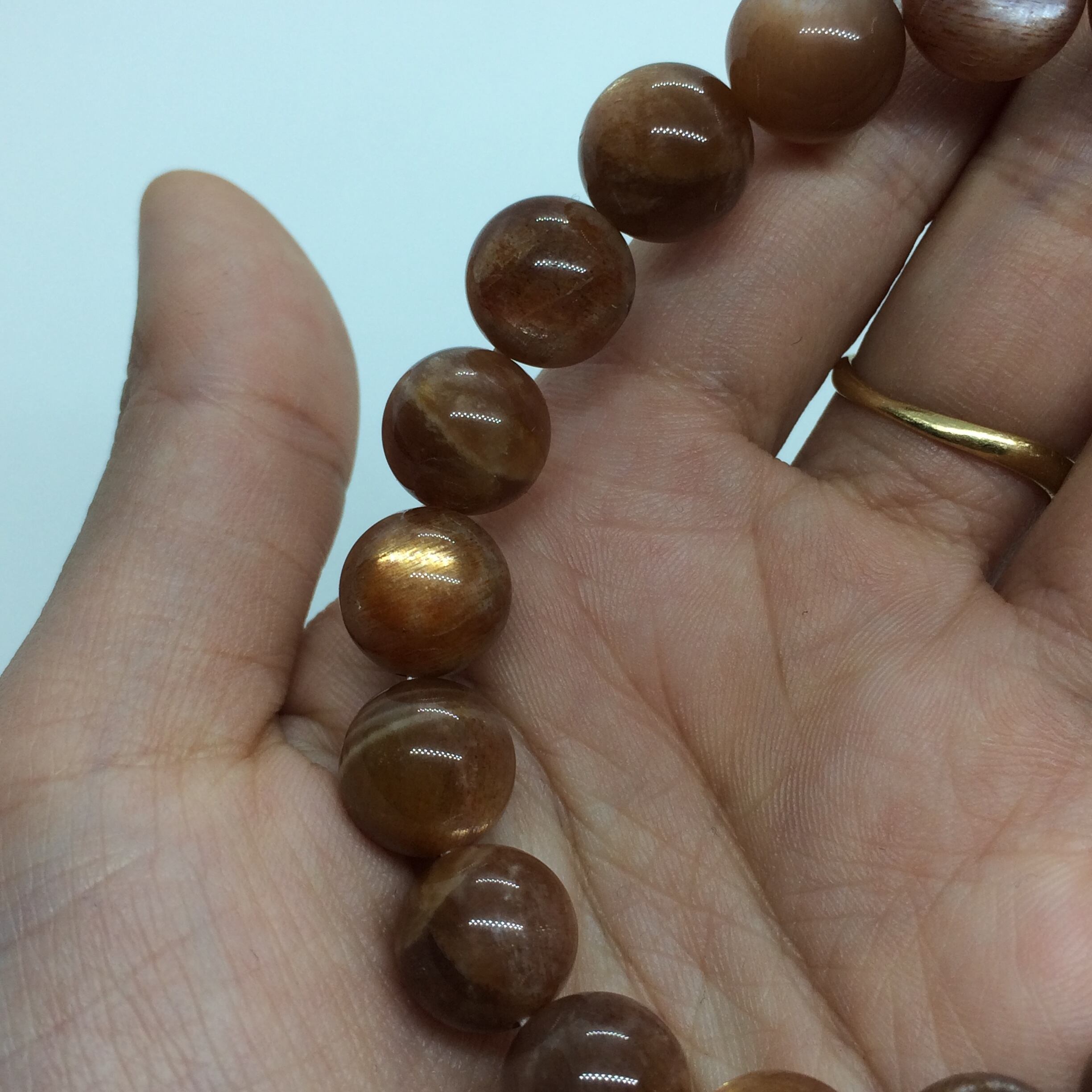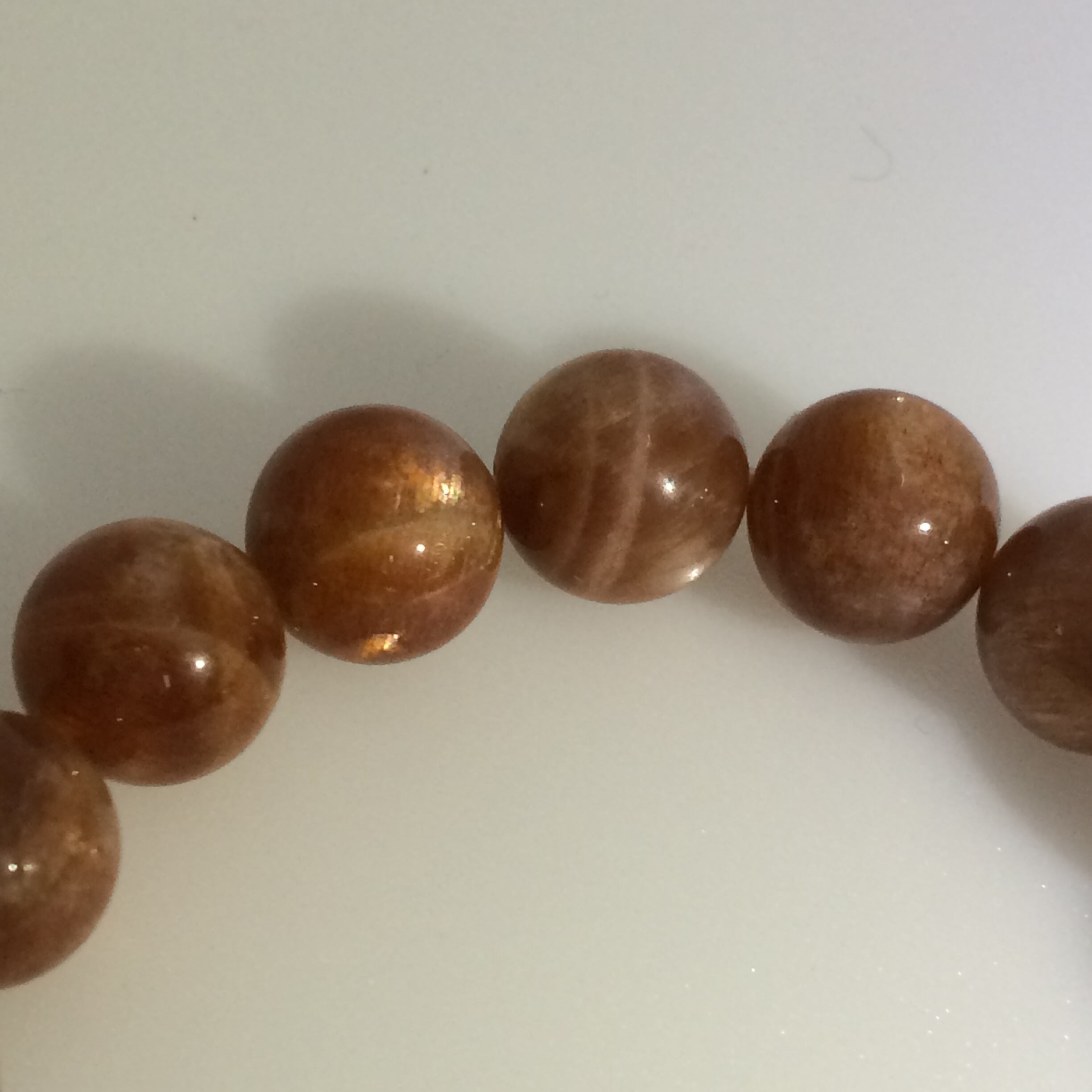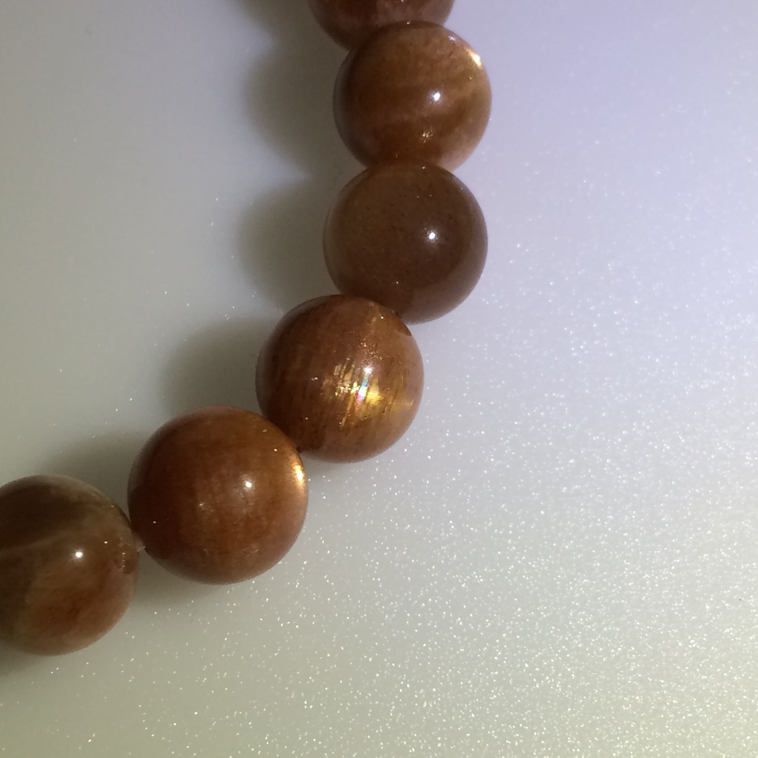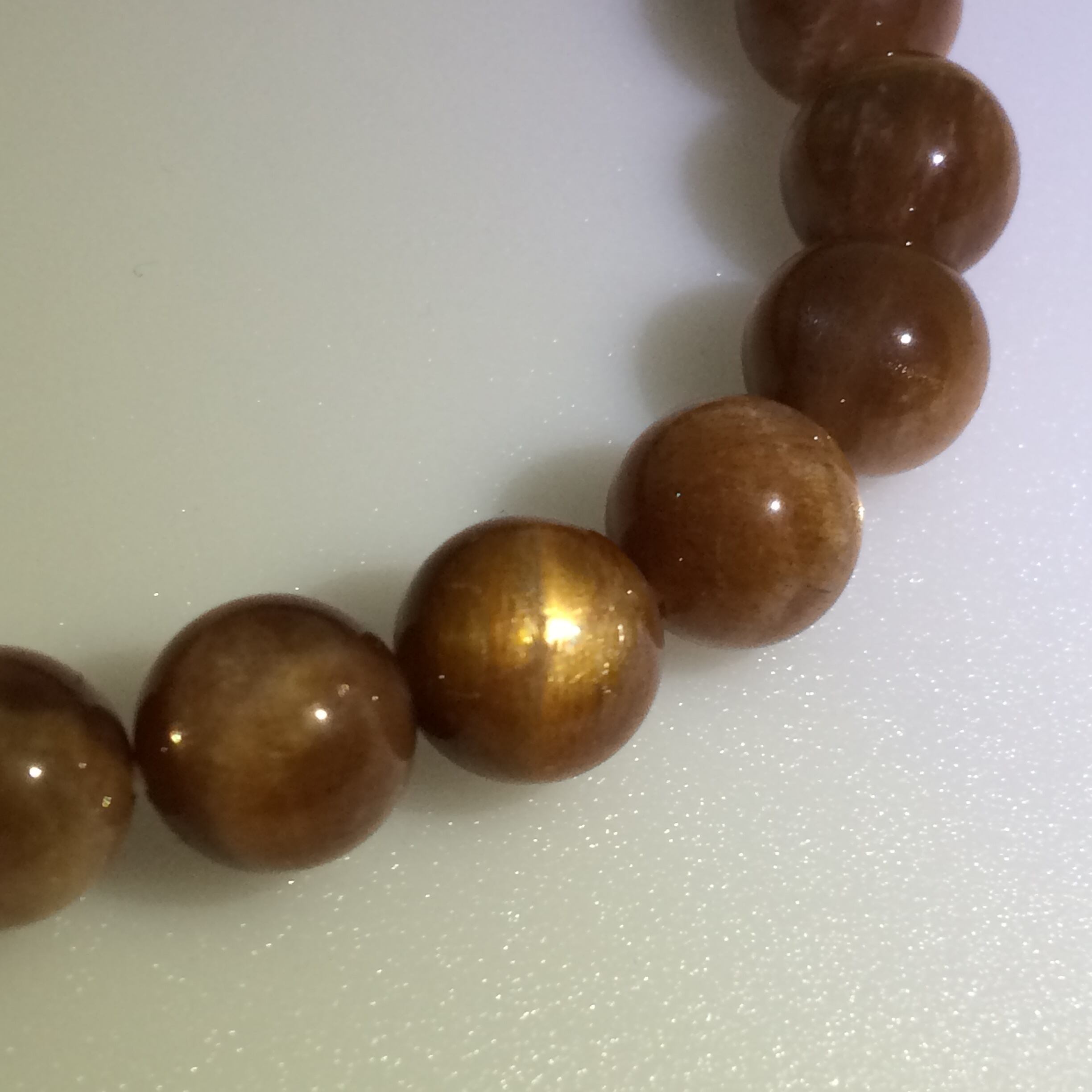 こちらのサンストーンはスター効果があるブレスレットで、強い光を当てなくても見ることが出来る粒も入っています(8~11枚目)。