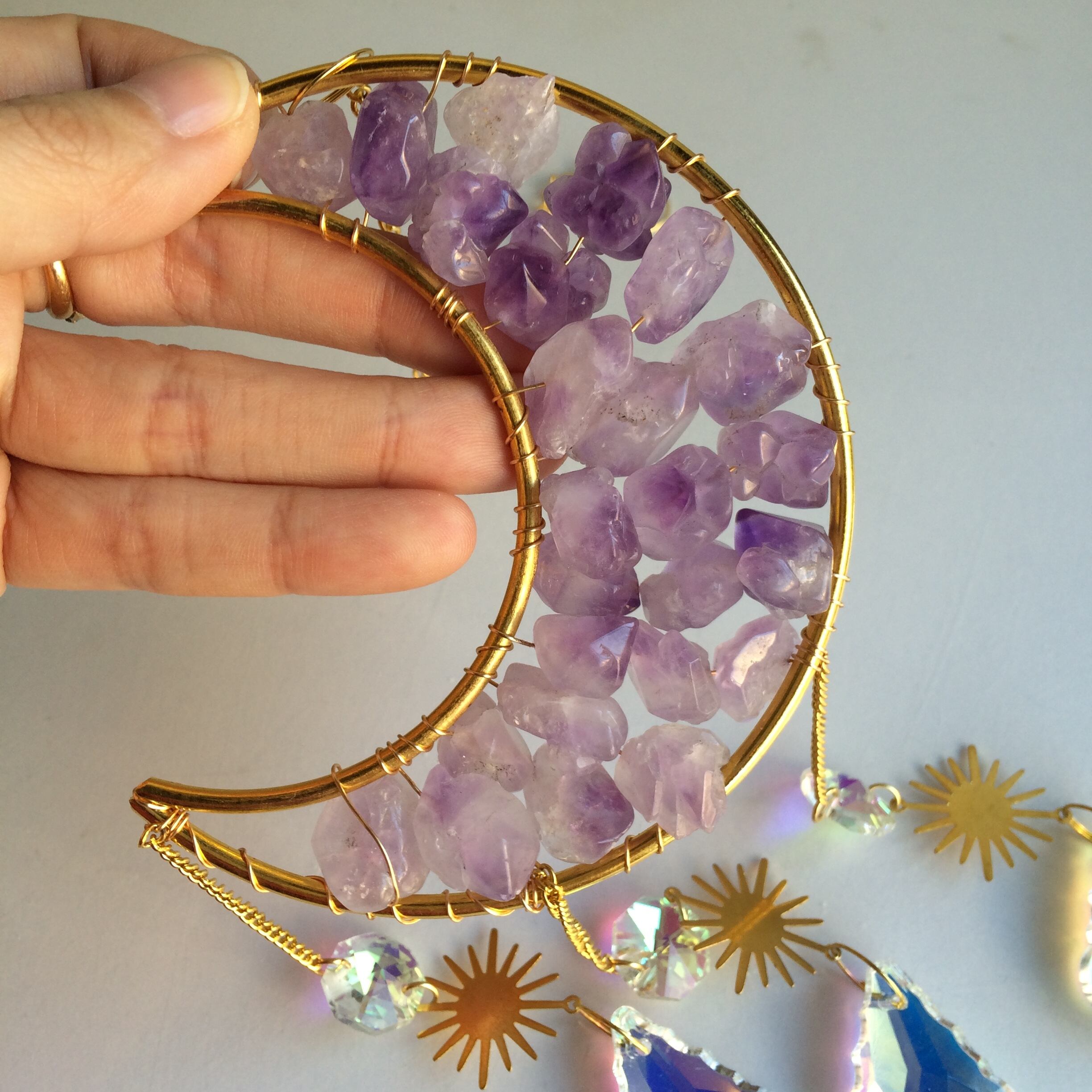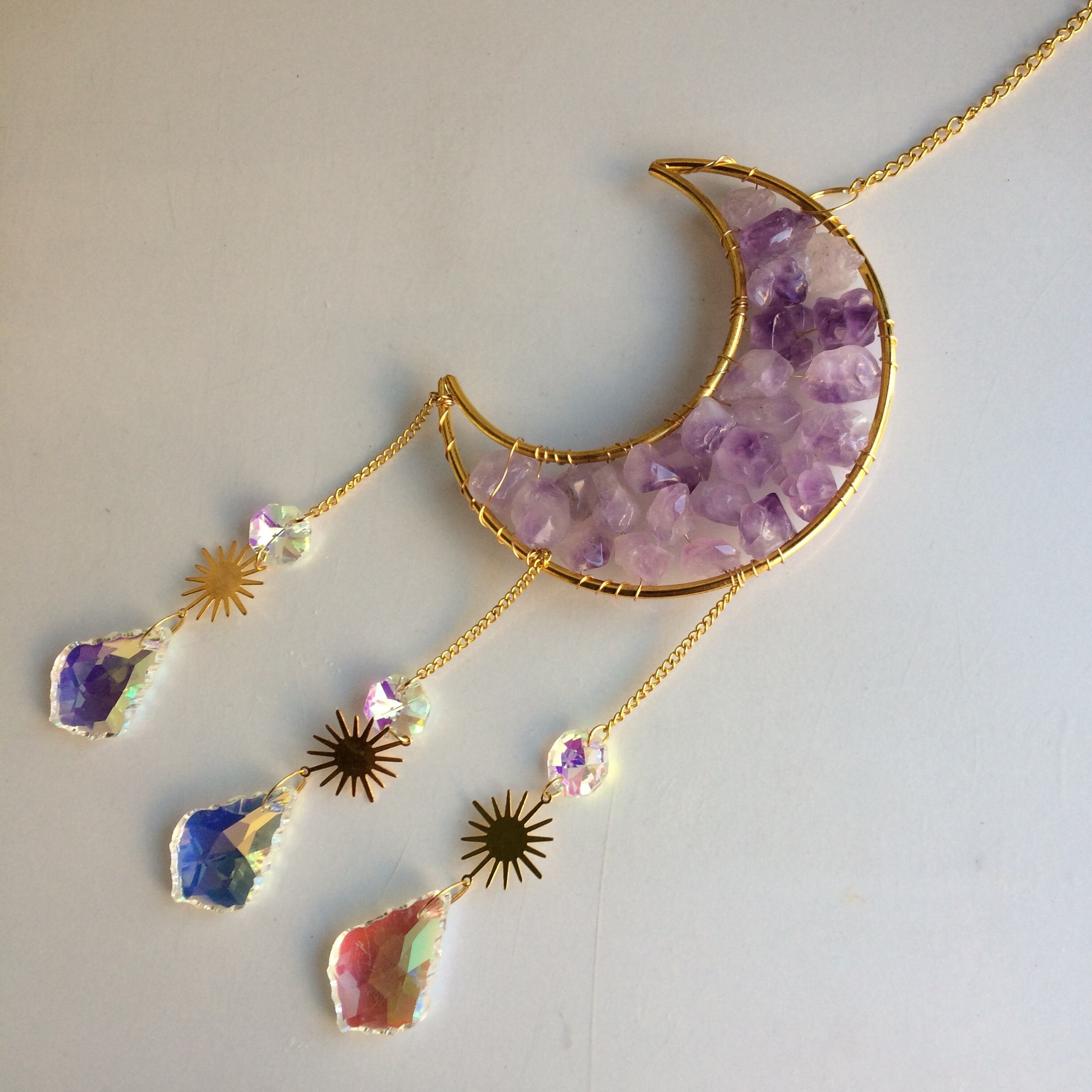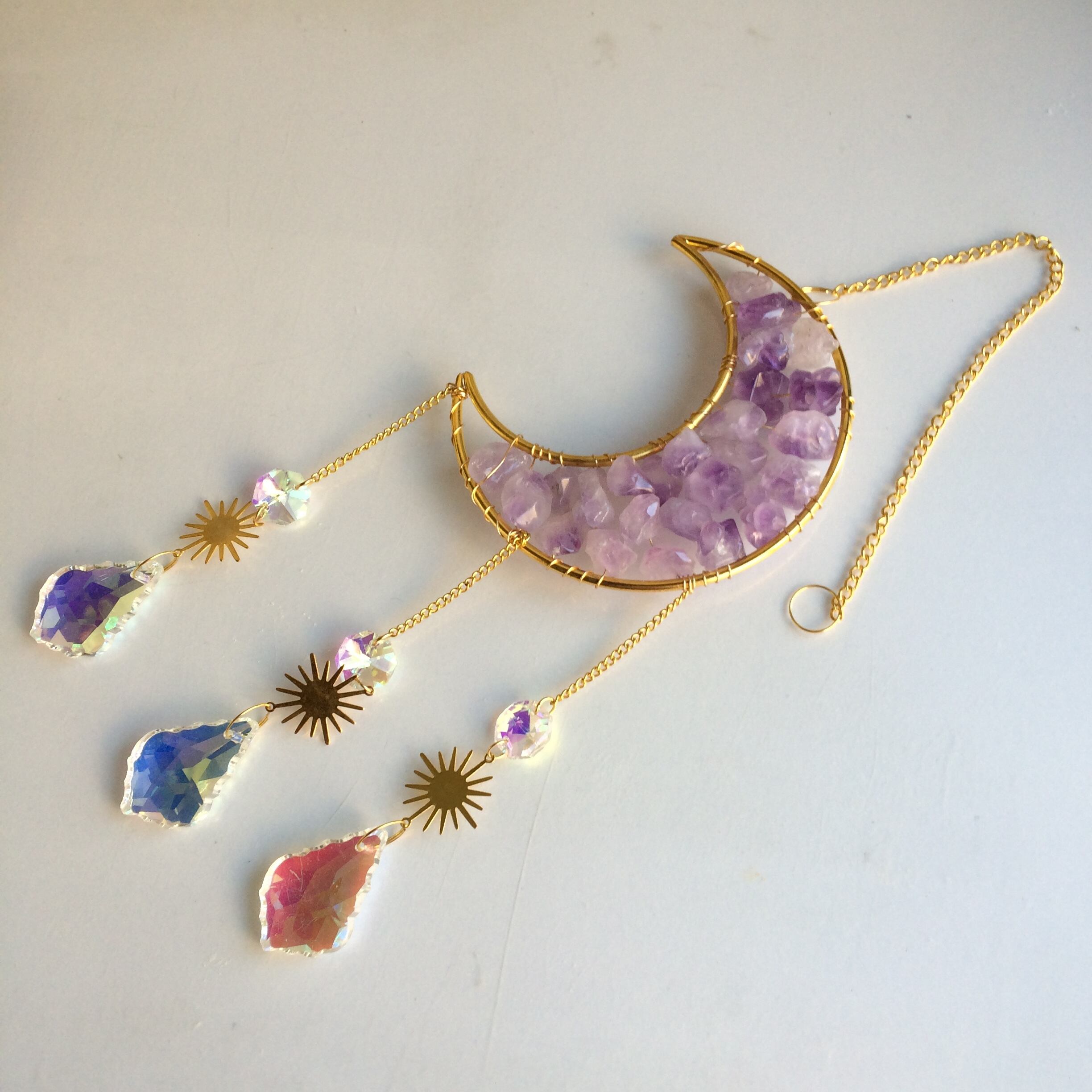 月のモチーフにアメジストが配置されており、下にゆらゆらと揺れるカットガラスが付いているサンキャッチャーです。