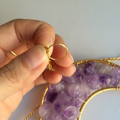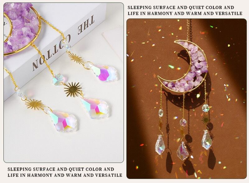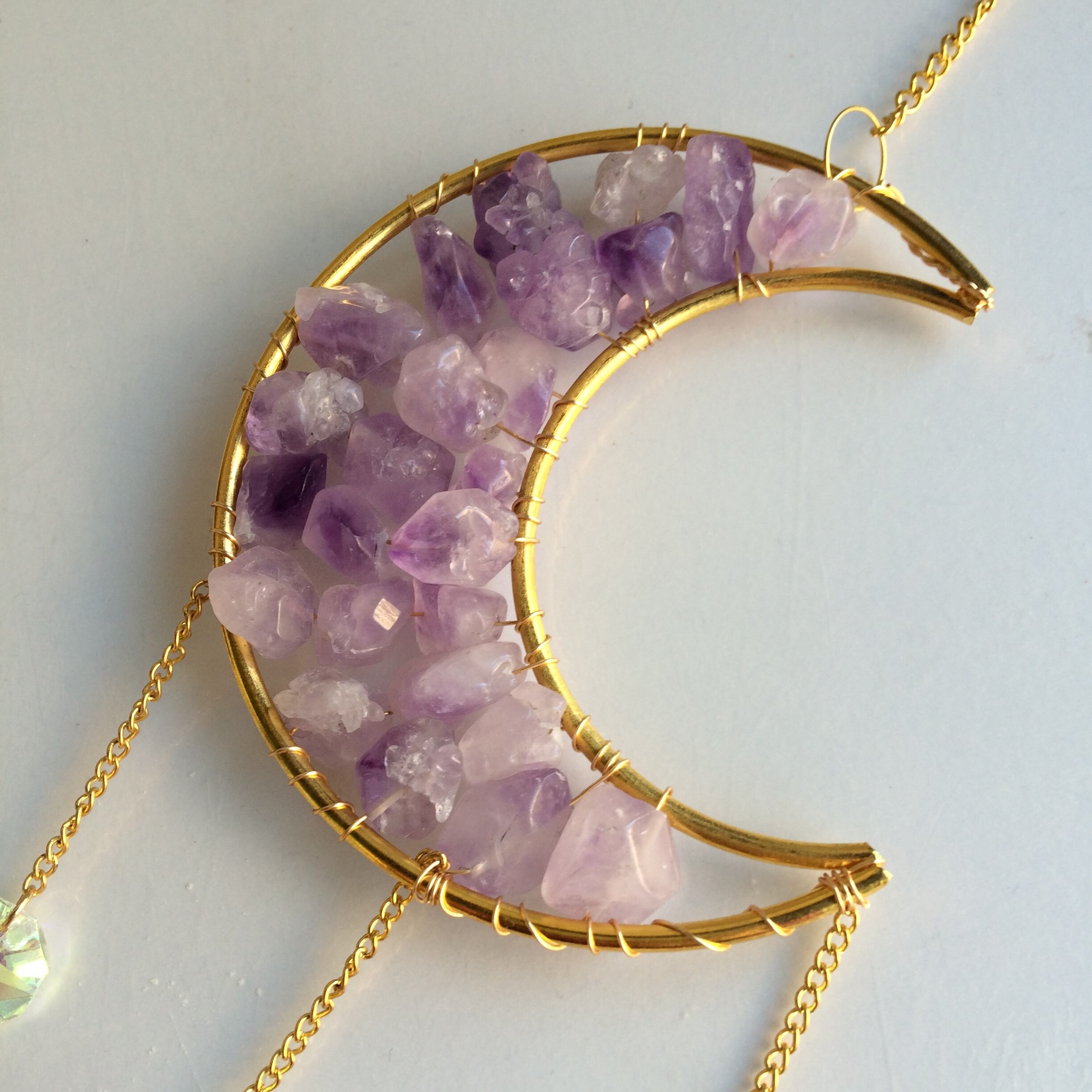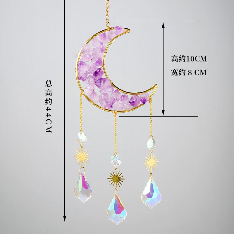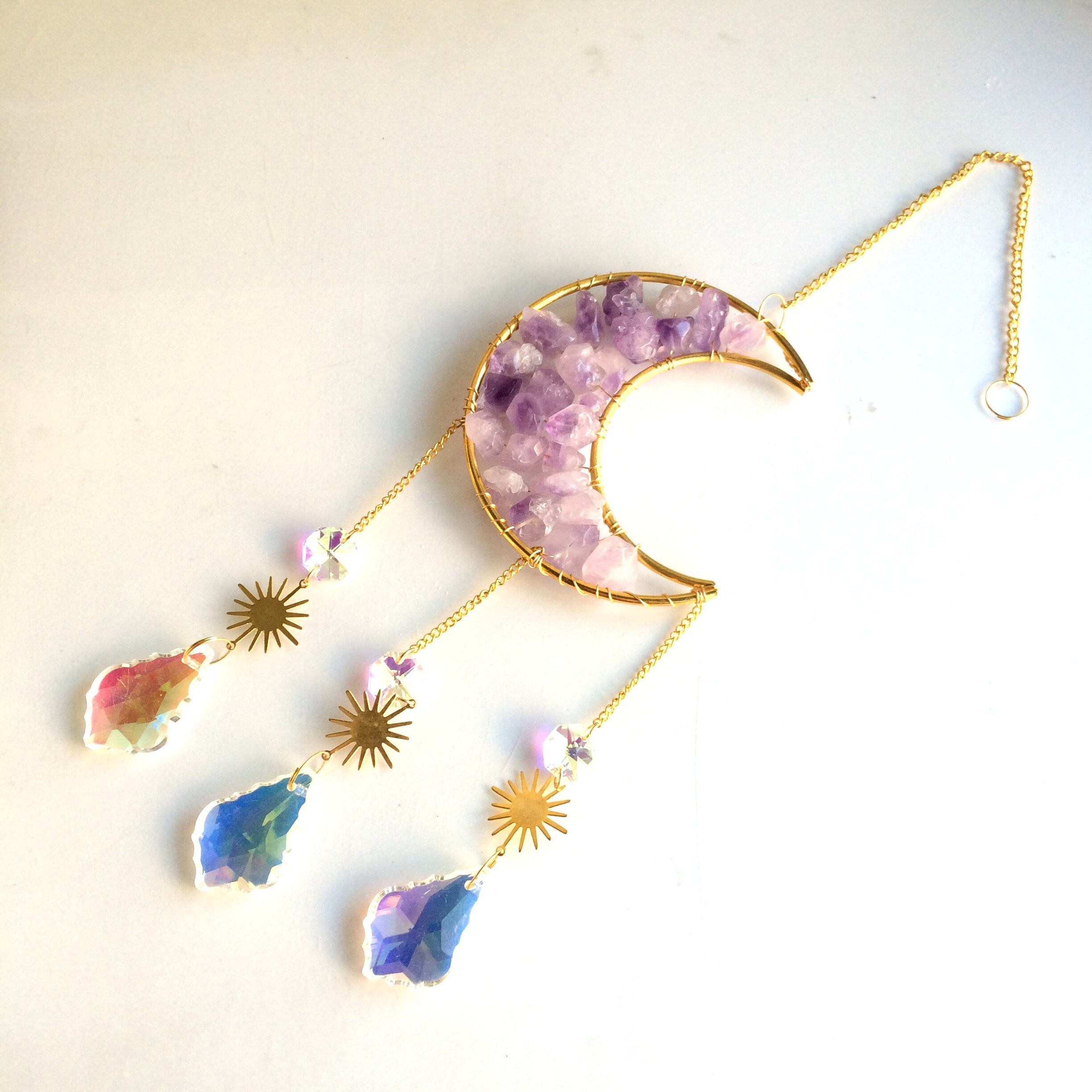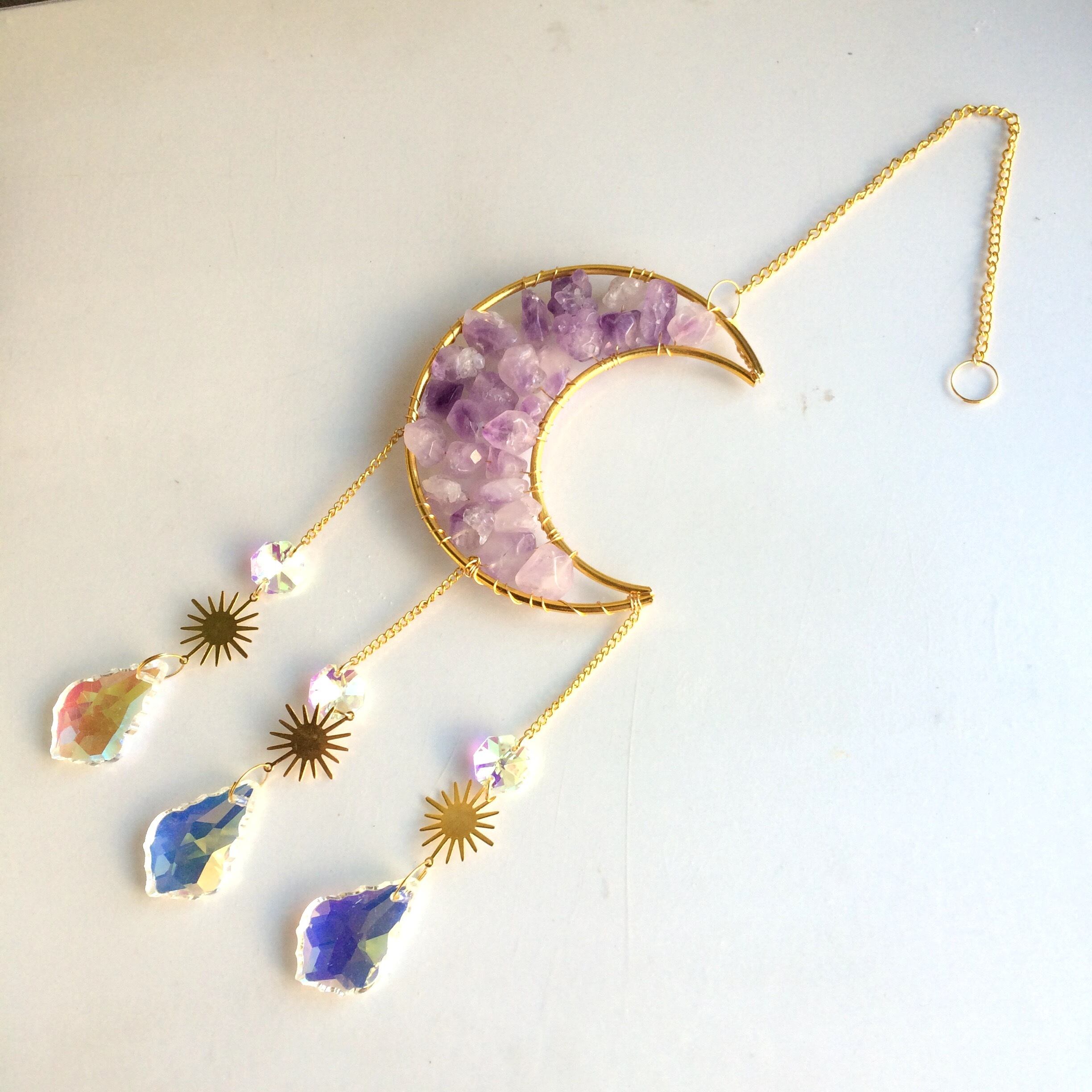月のモチーフにアメジストが配置されており、下にゆらゆらと揺れるカットガラスが付いているサンキャッチャーです。