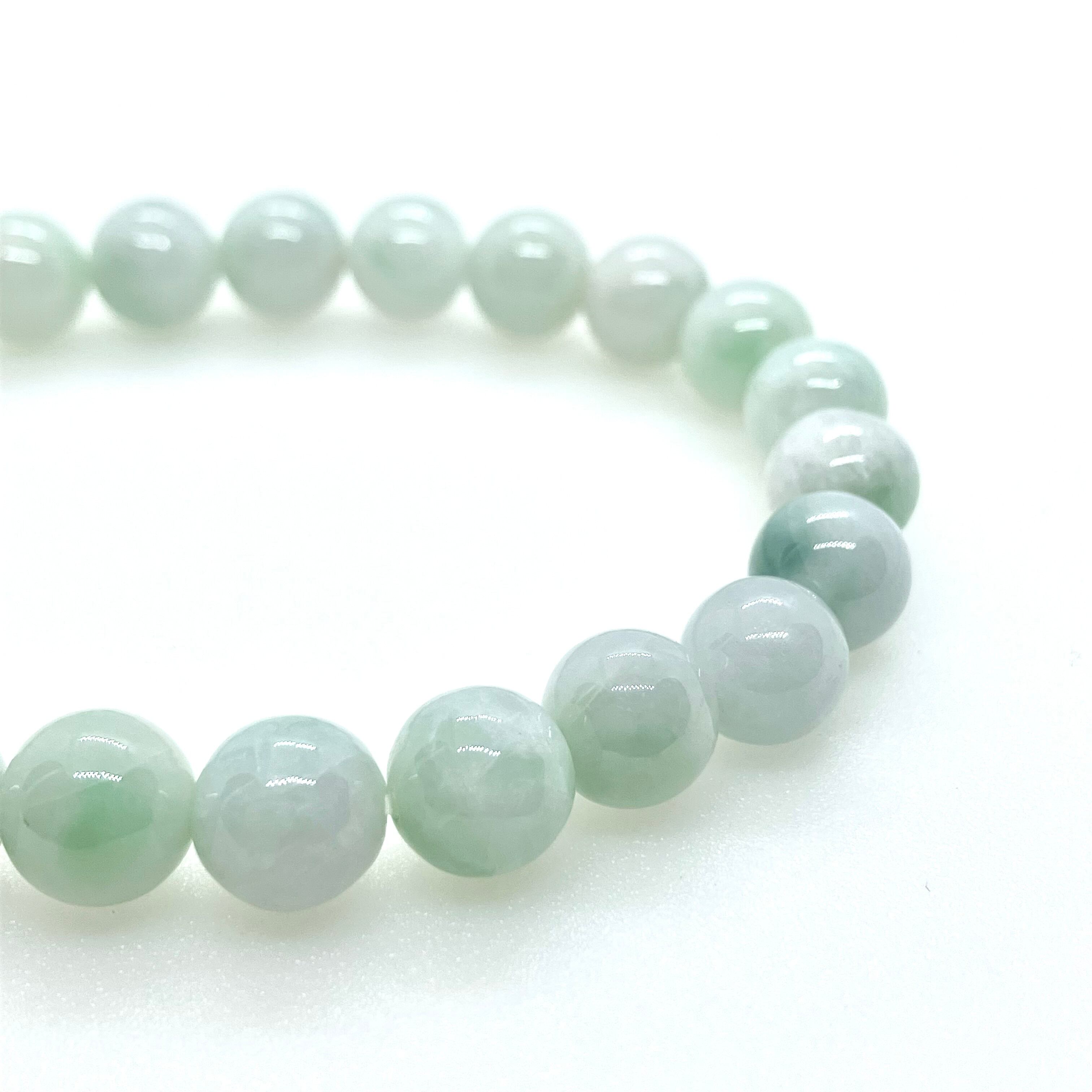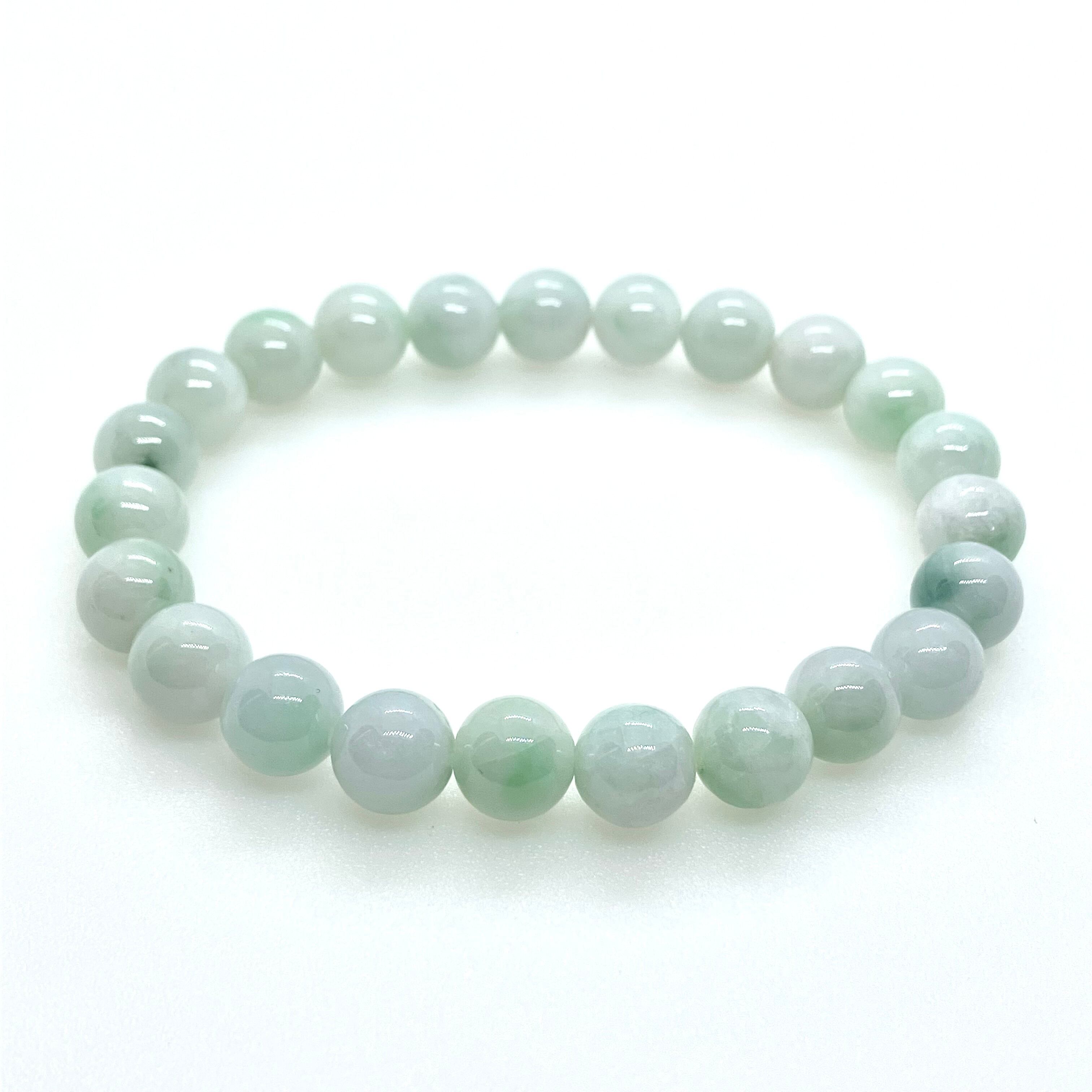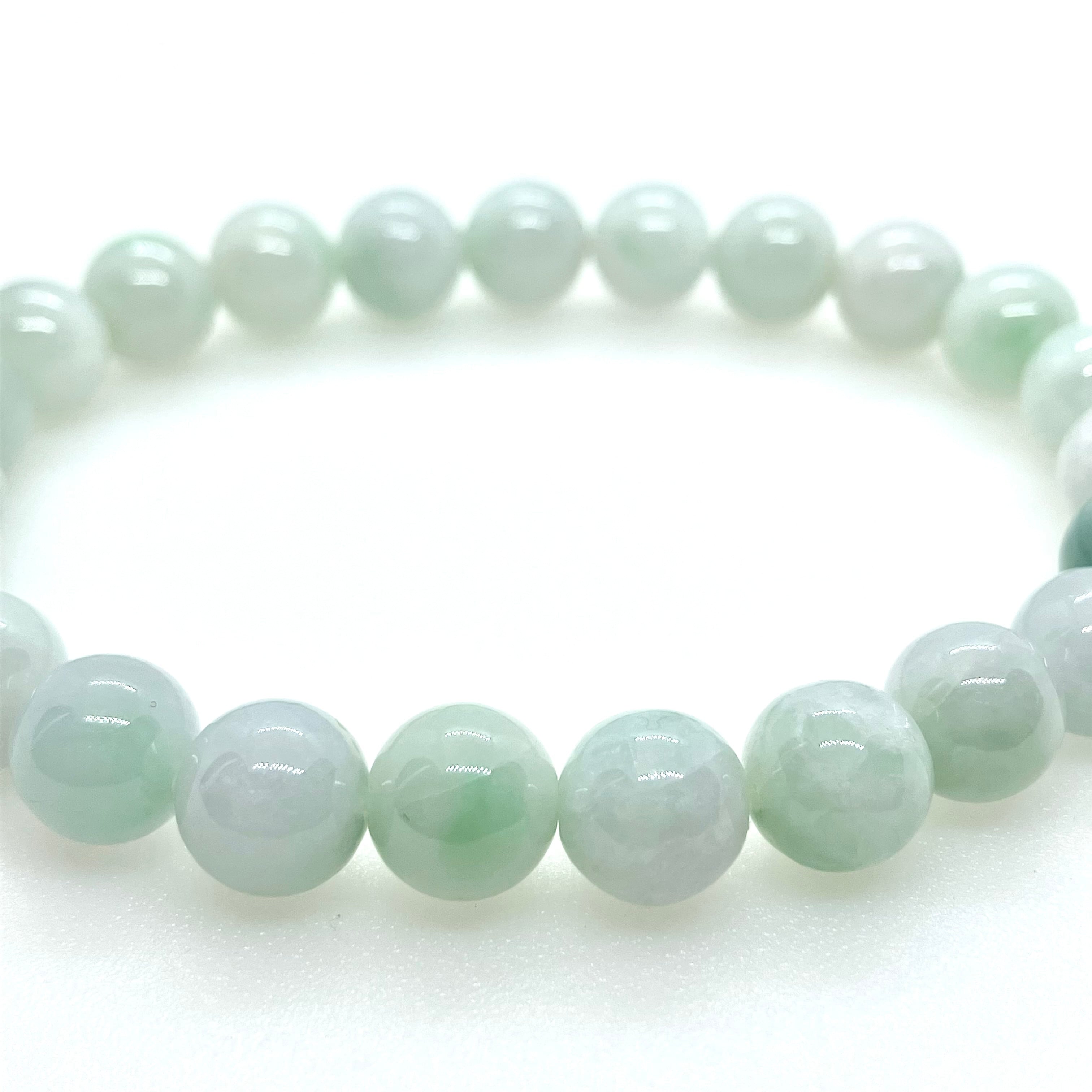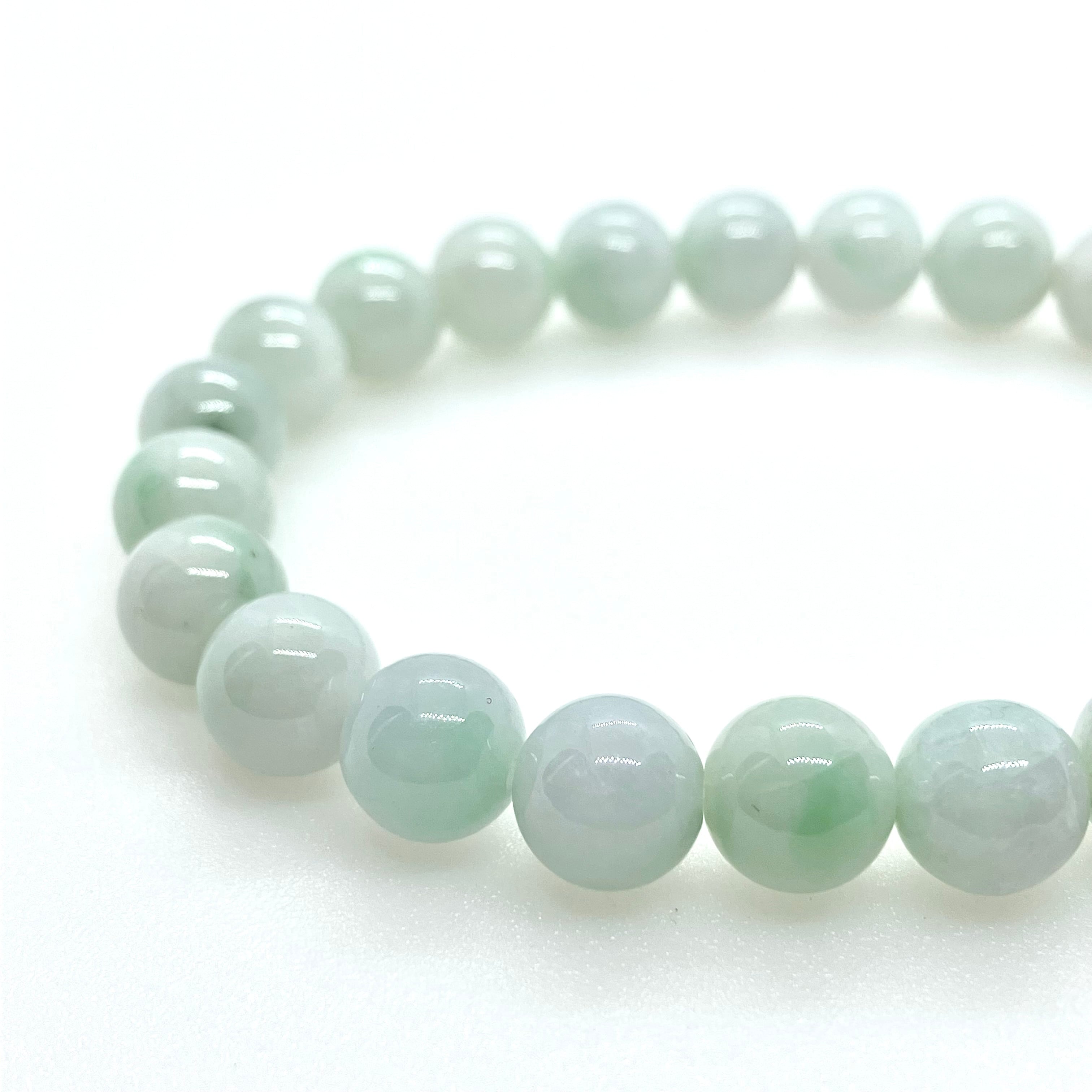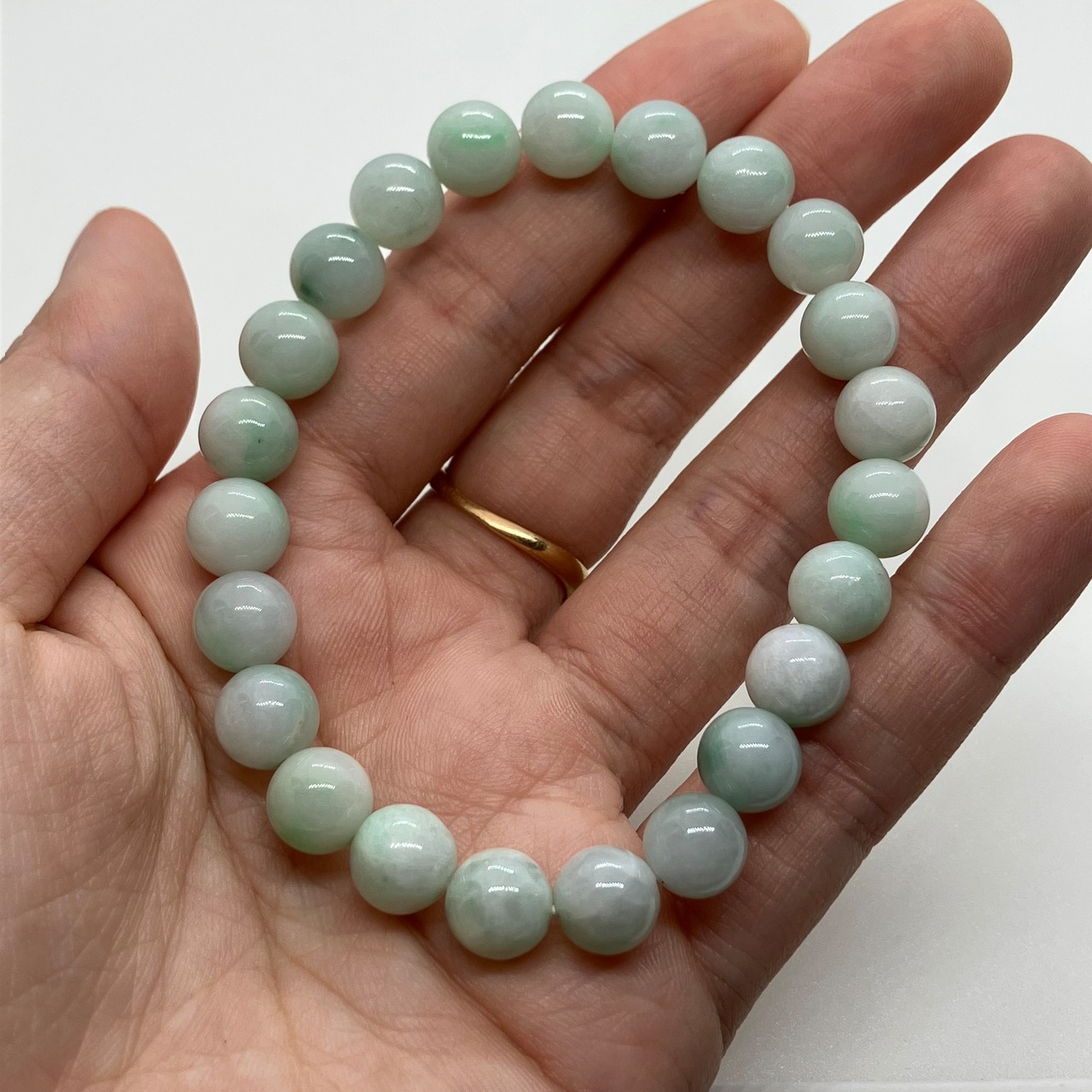 こちらはミャンマー産です。翡翠の白地に美しいアップルグリーンが、所々に鮮やかに入り込むブレスレットです。