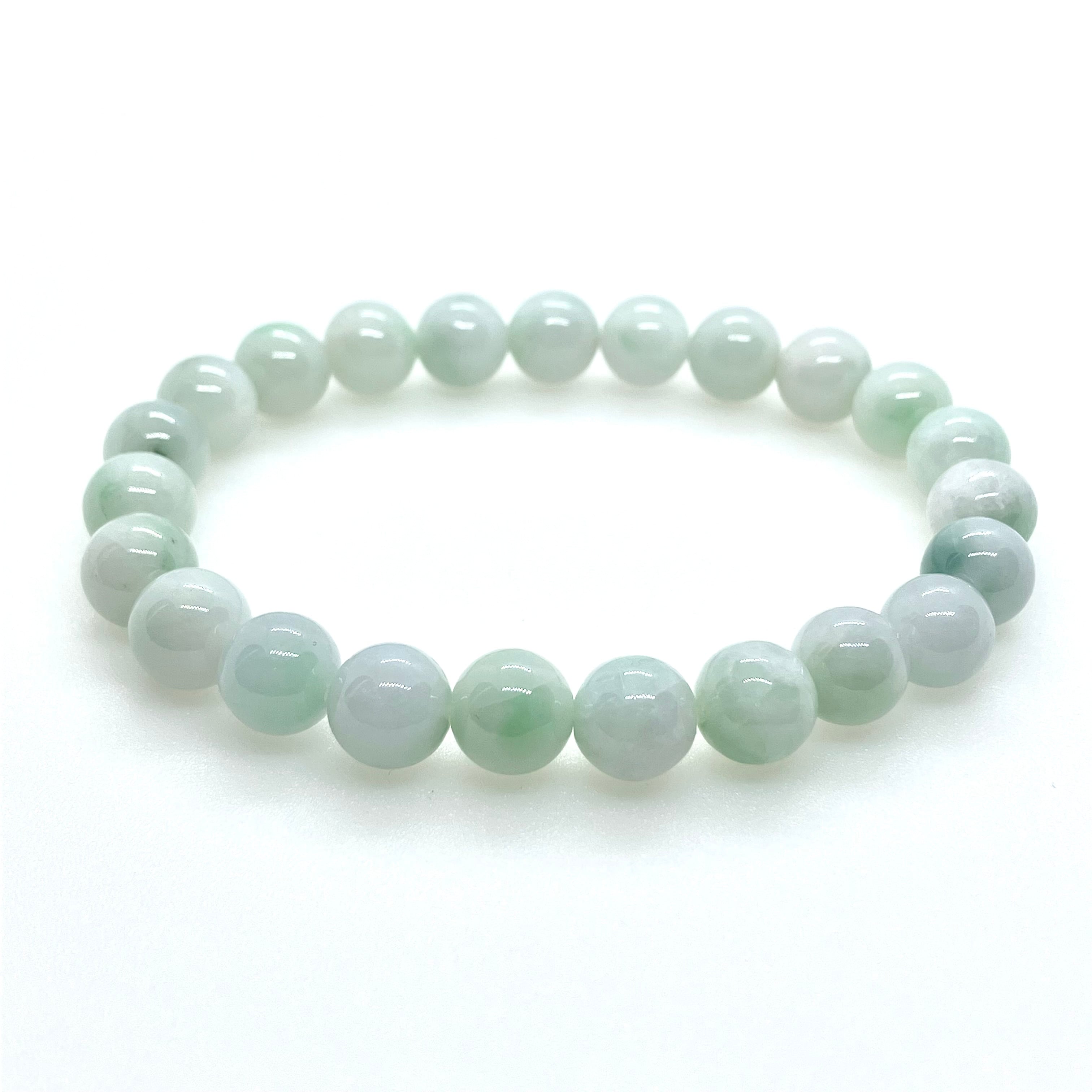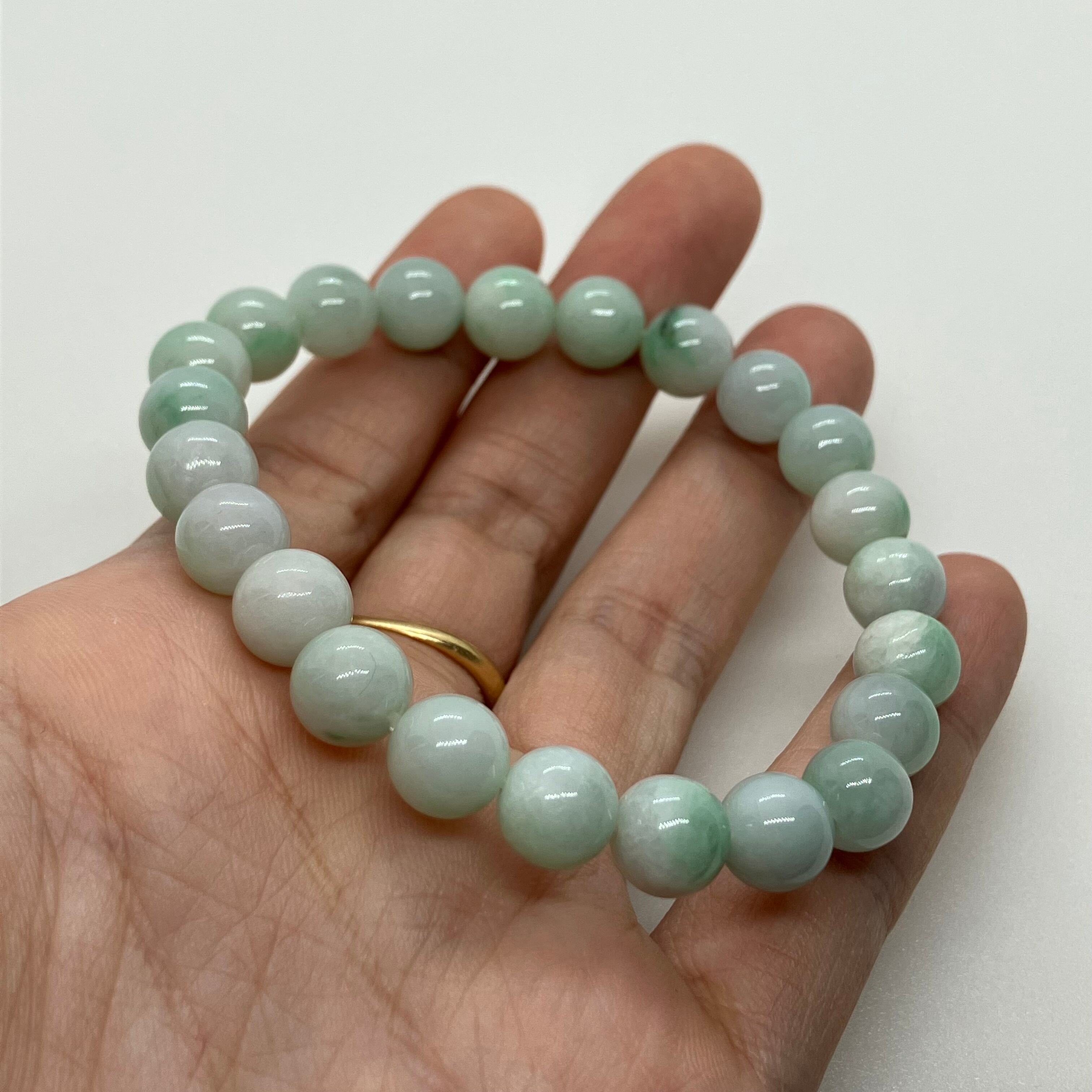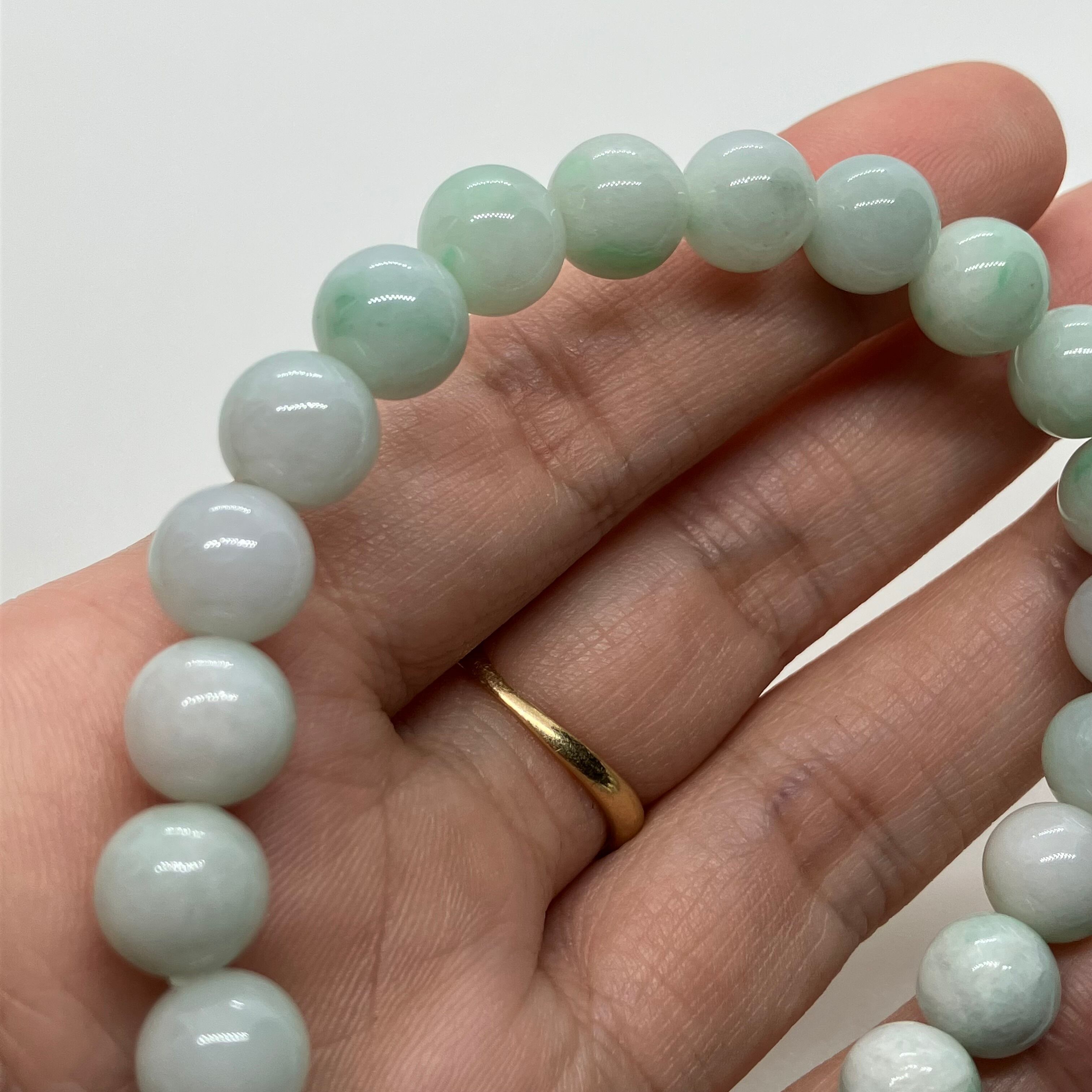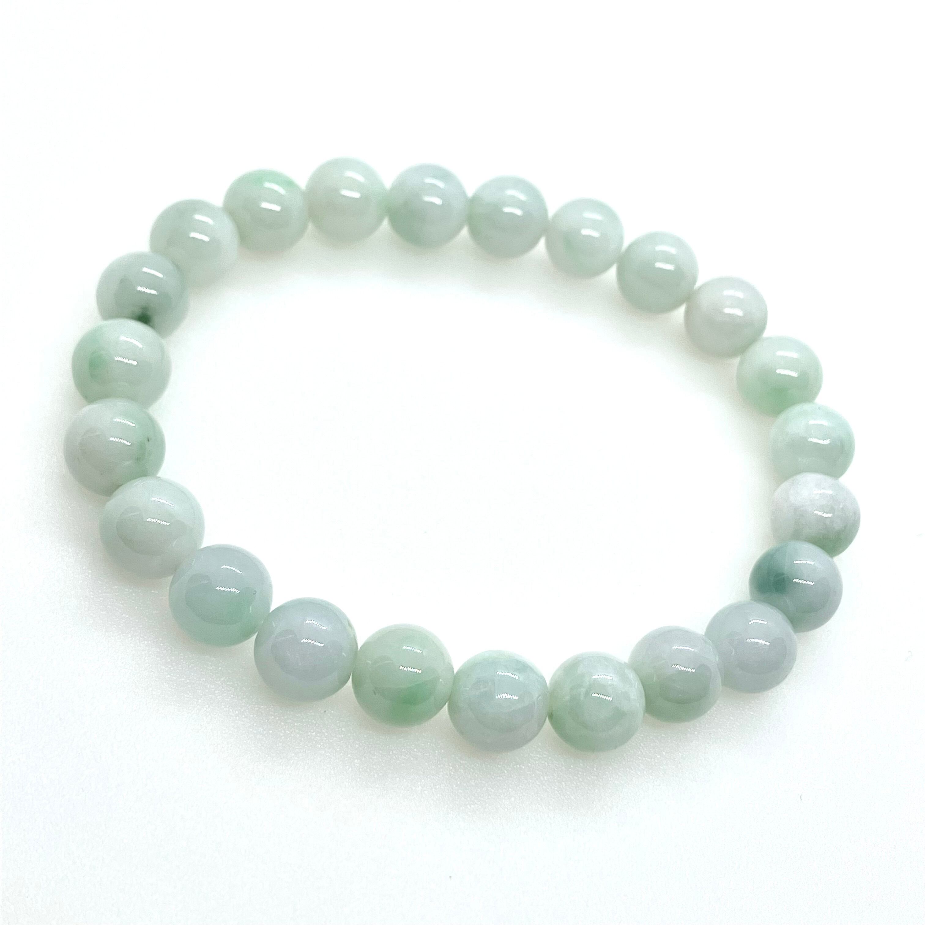 こちらはミャンマー産です。翡翠の白地に美しいアップルグリーンが、所々に鮮やかに入り込むブレスレットです。