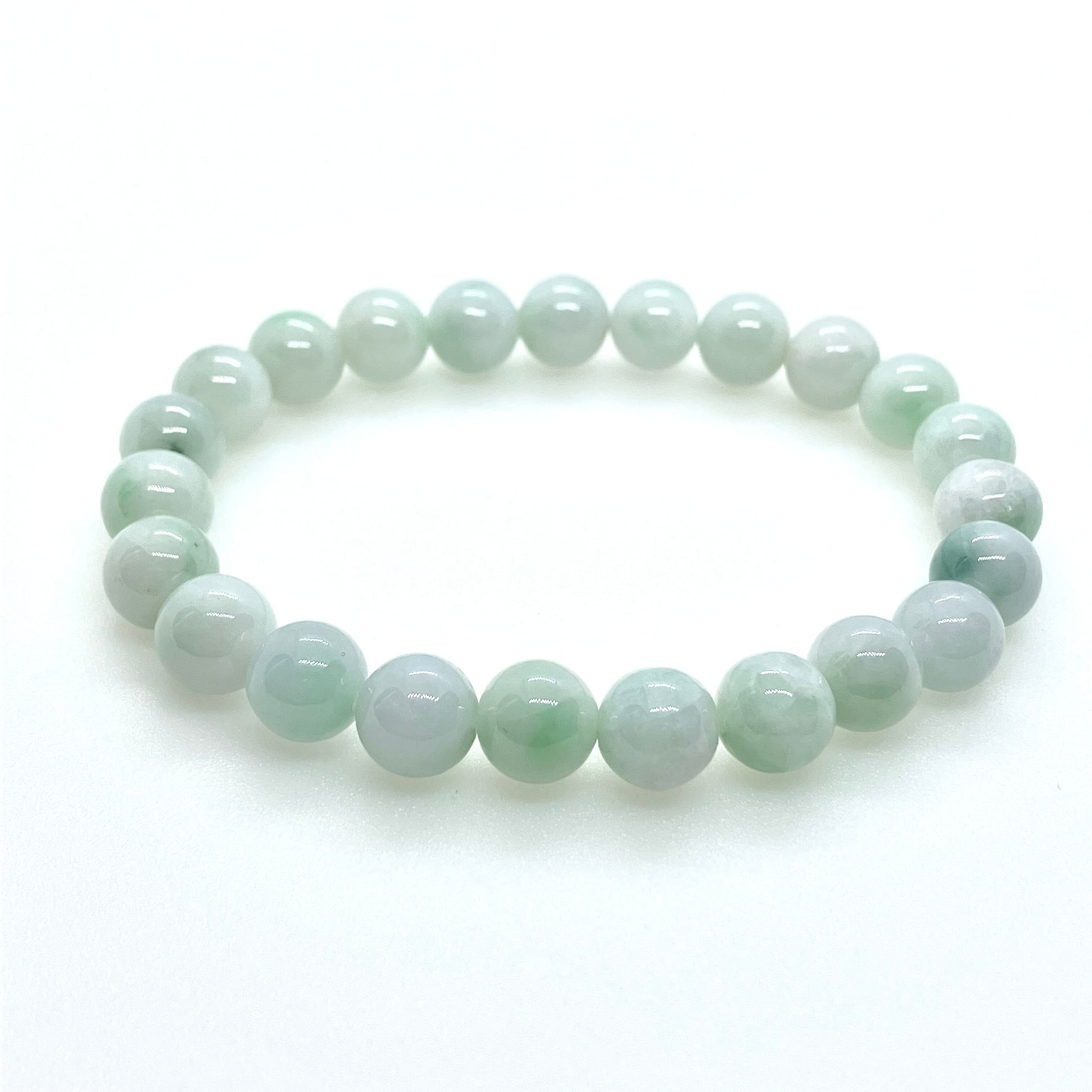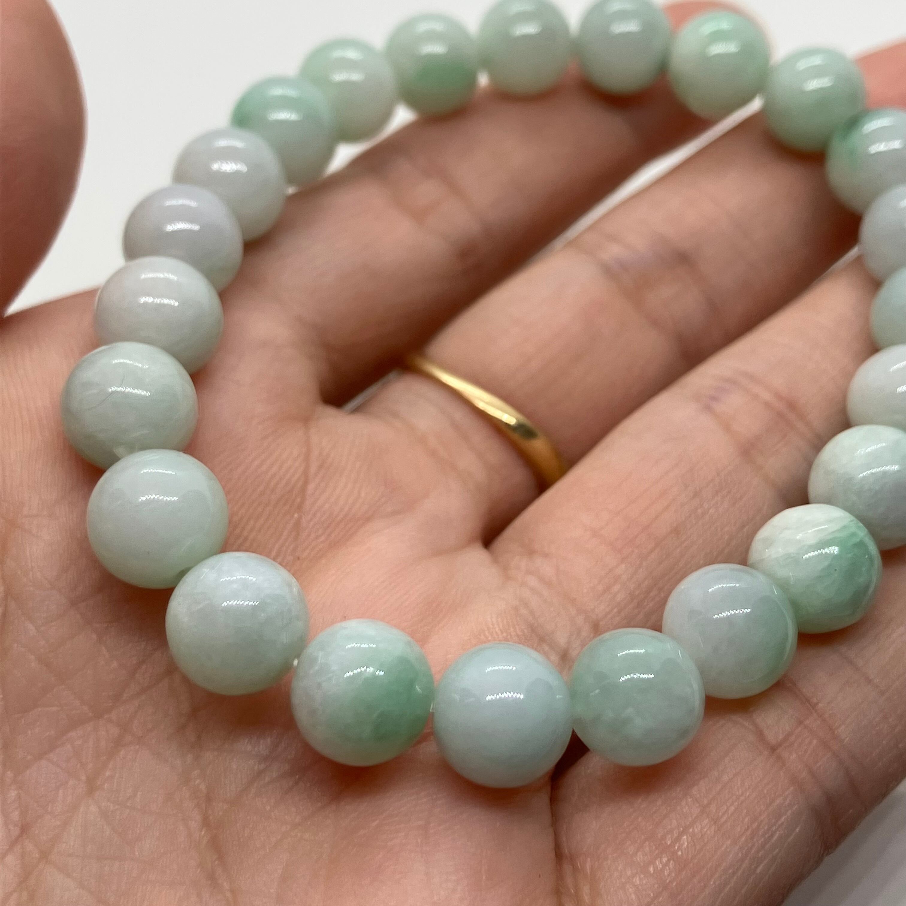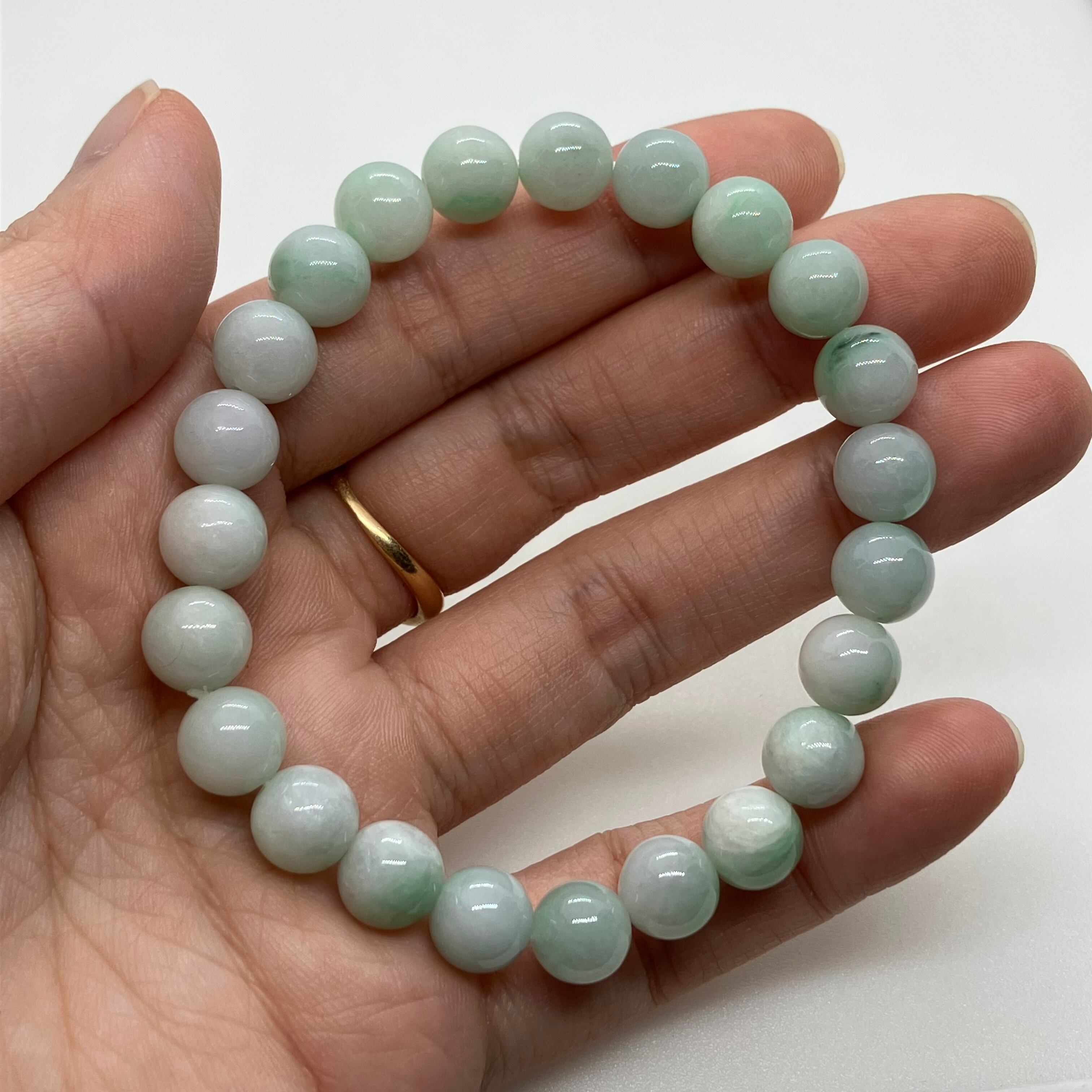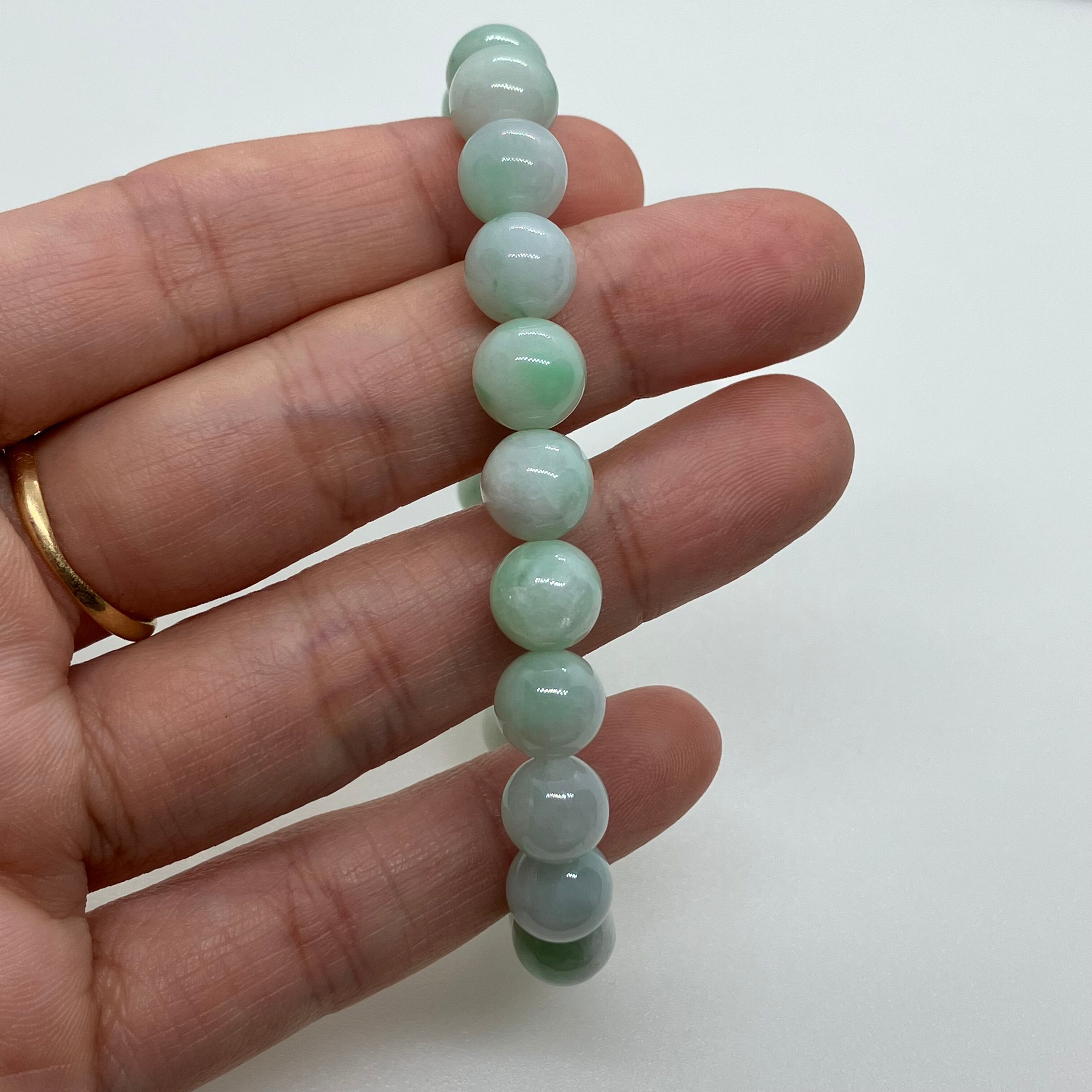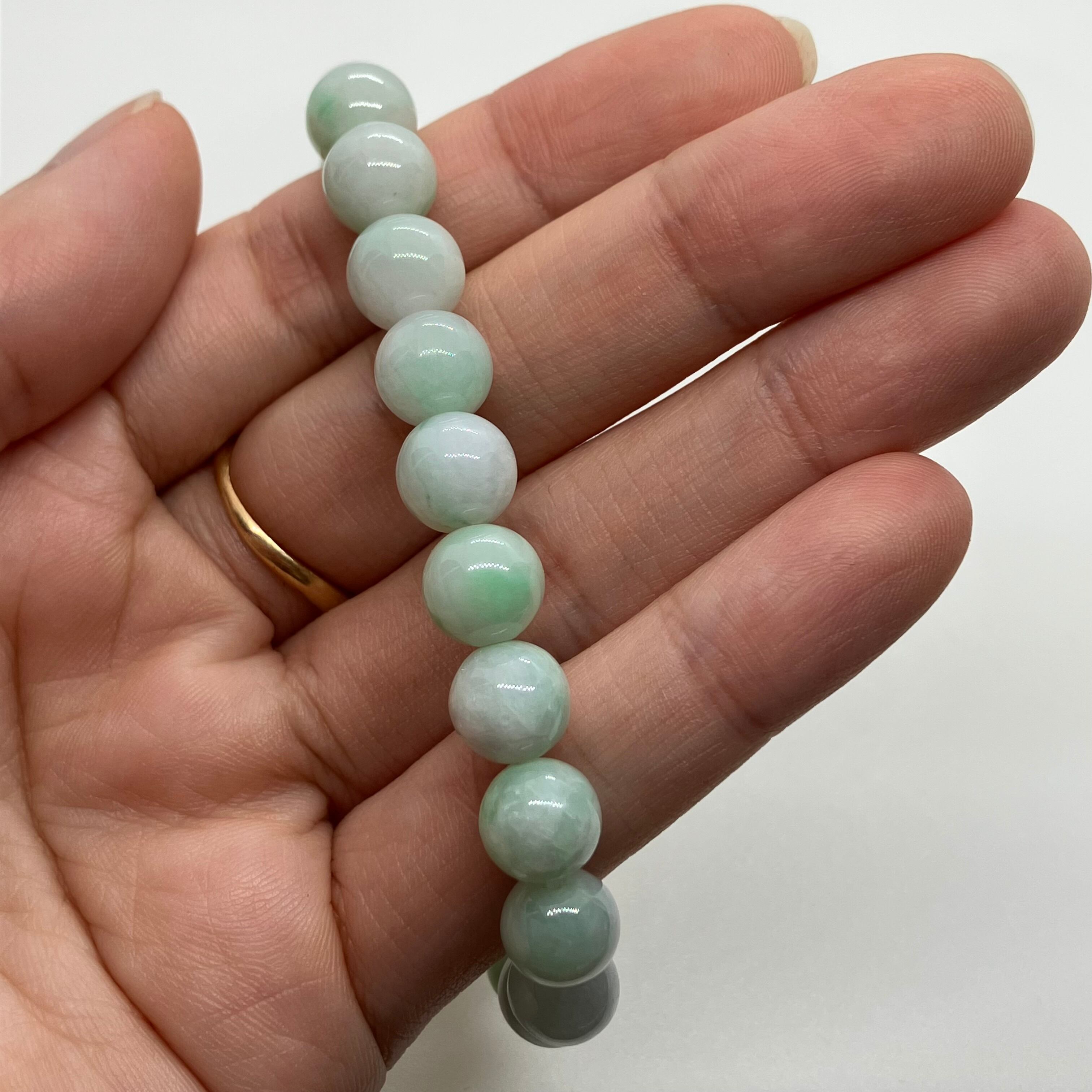 こちらはミャンマー産です。翡翠の白地に美しいアップルグリーンが、所々に鮮やかに入り込むブレスレットです。