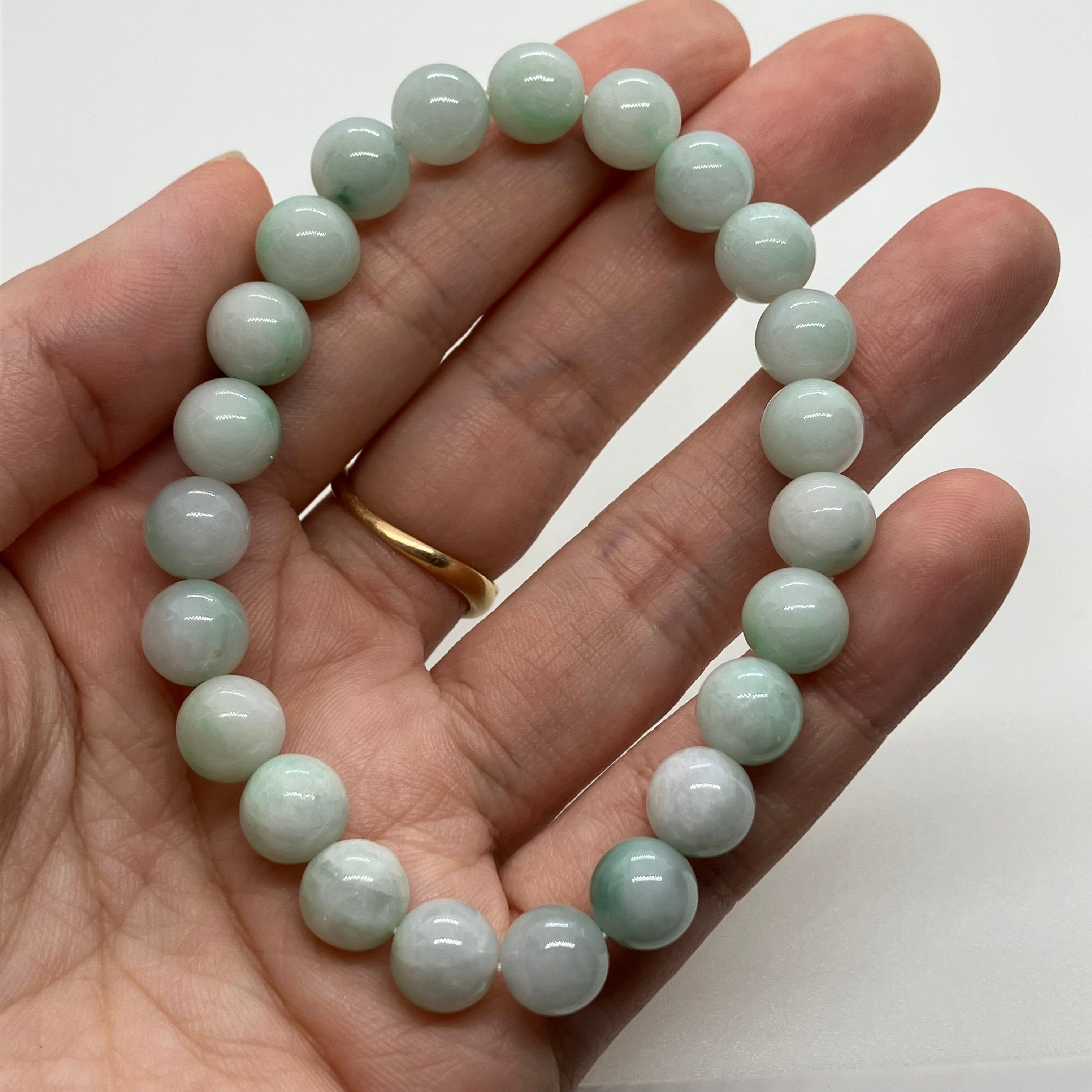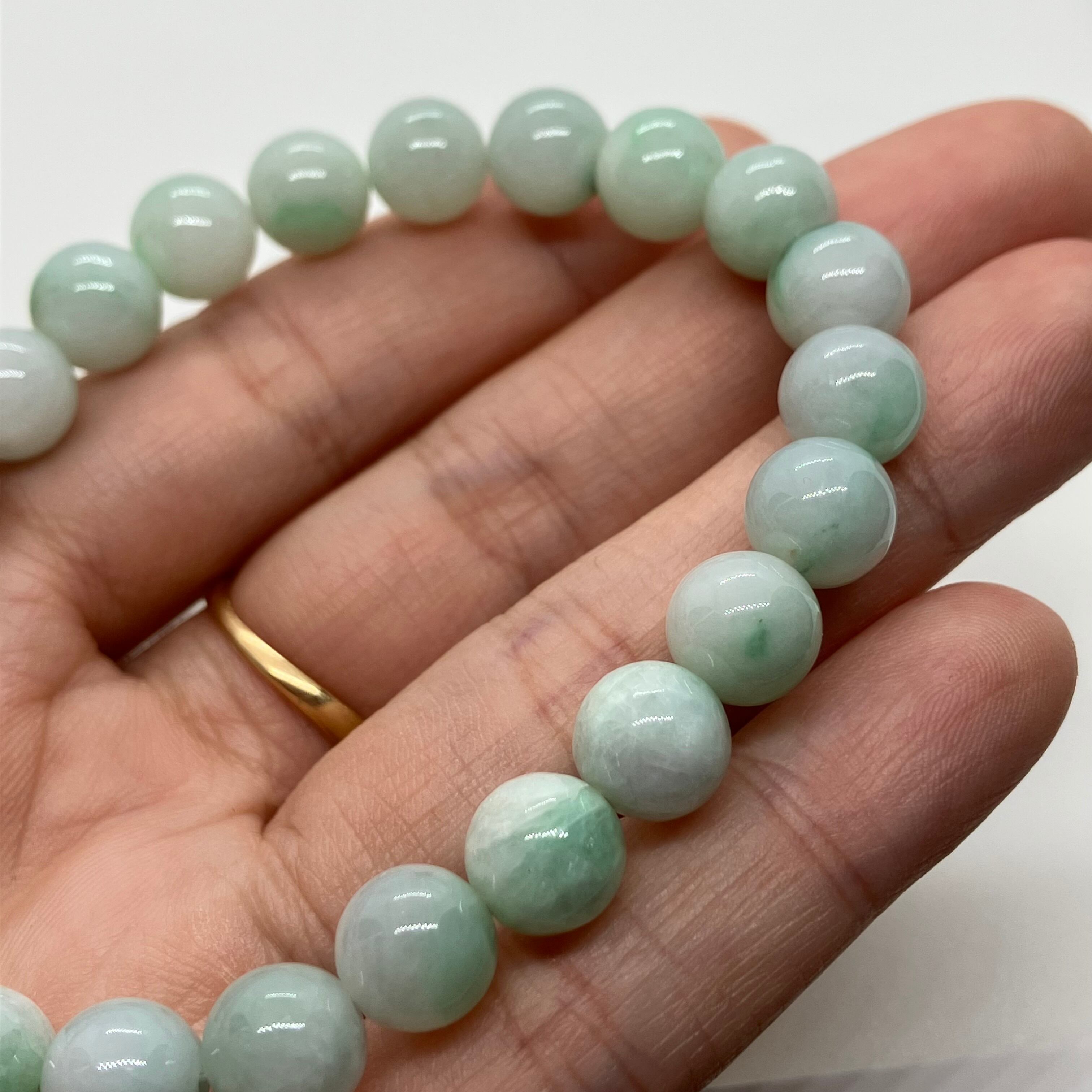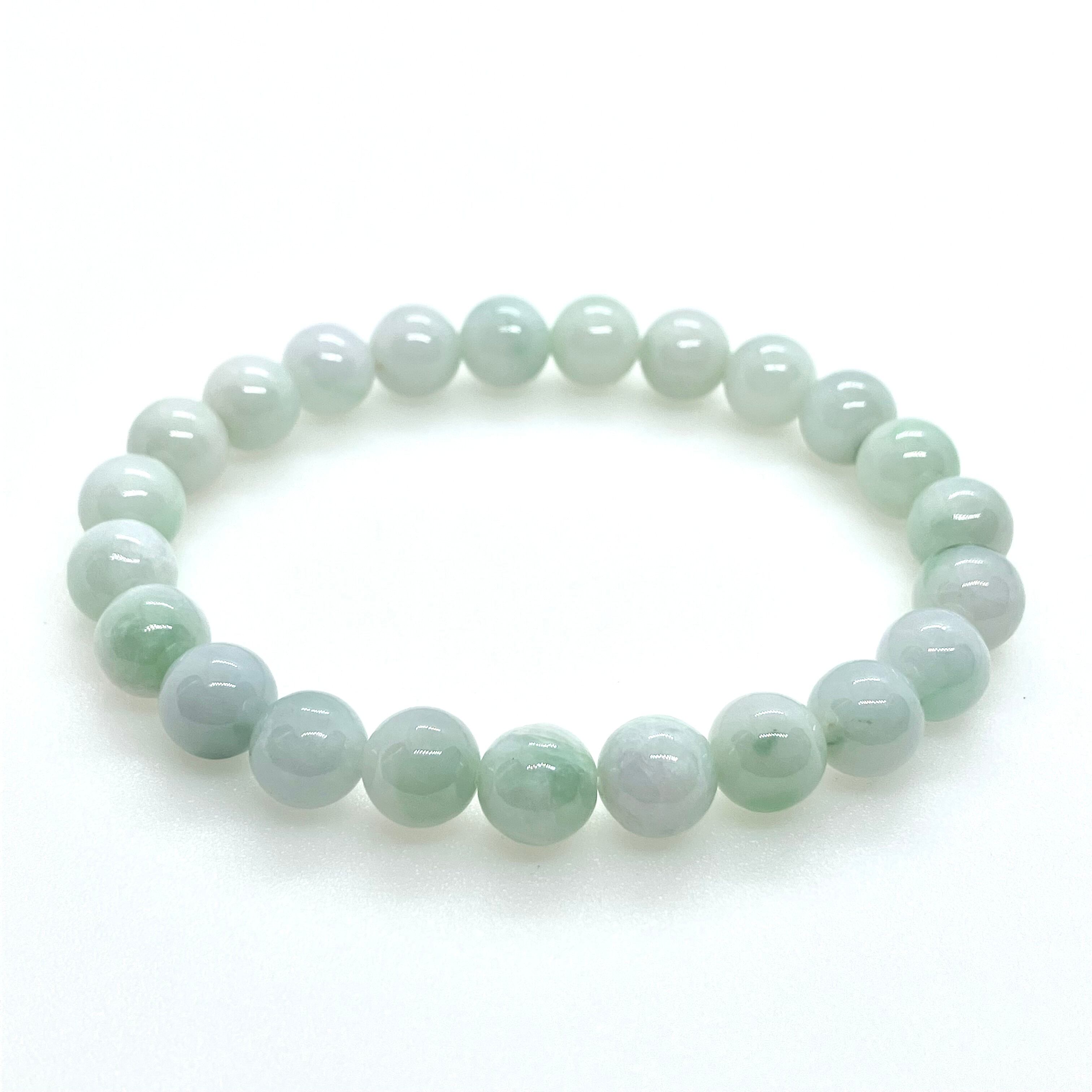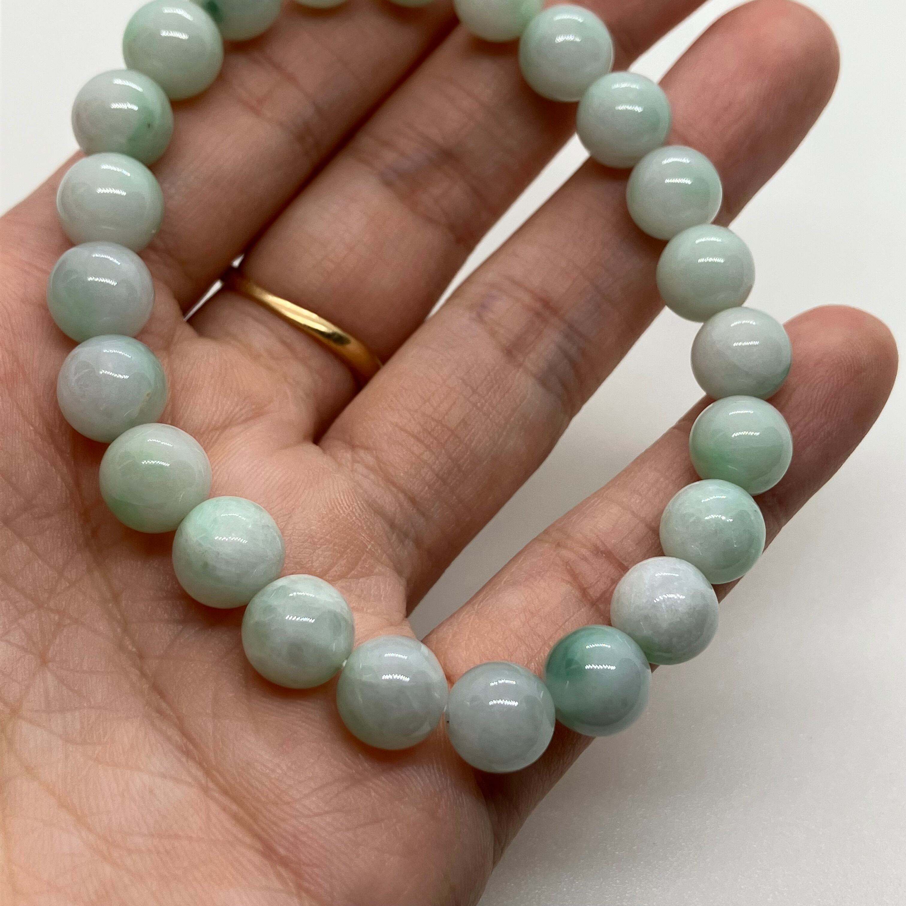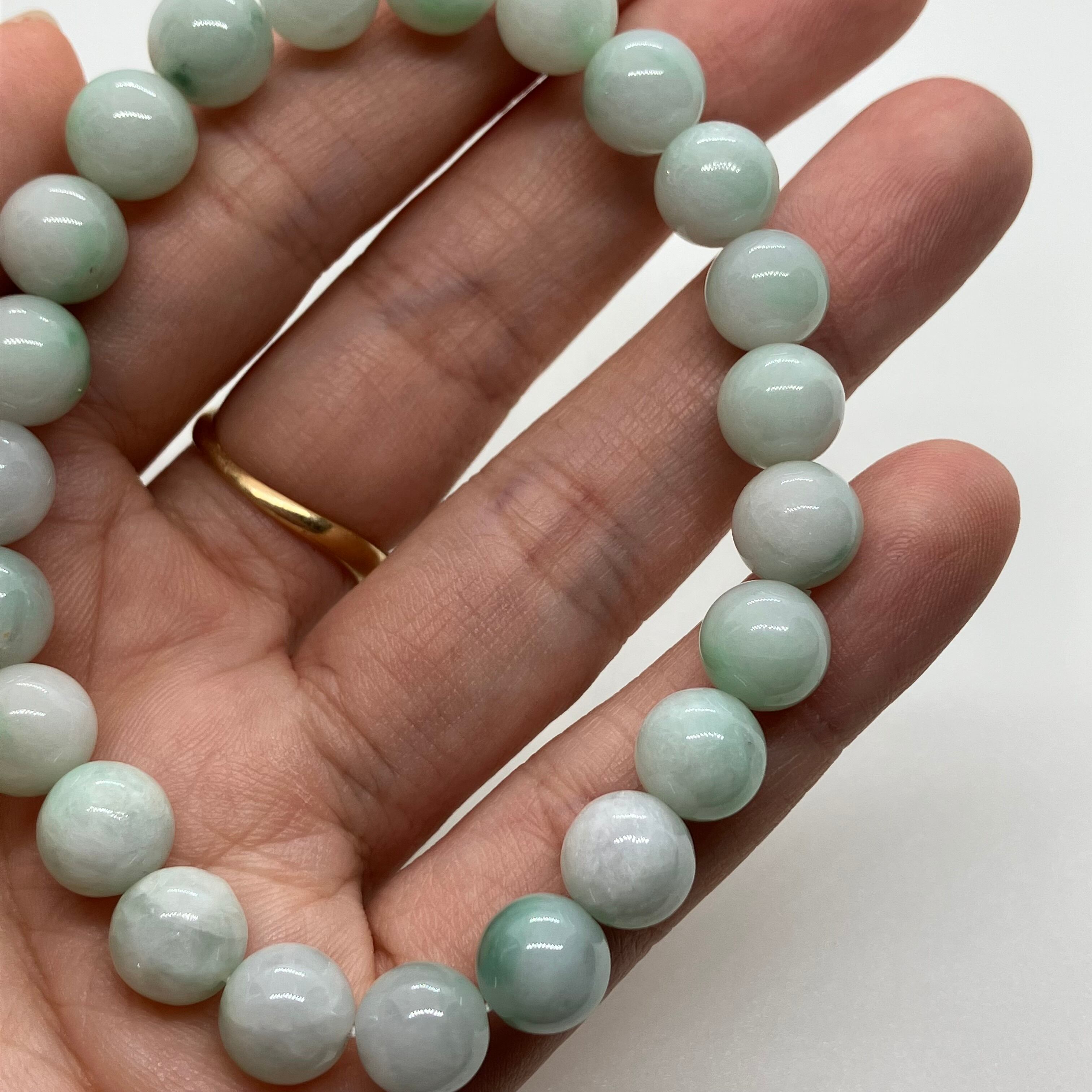 こちらはミャンマー産です。翡翠の白地に美しいアップルグリーンが、所々に鮮やかに入り込むブレスレットです。